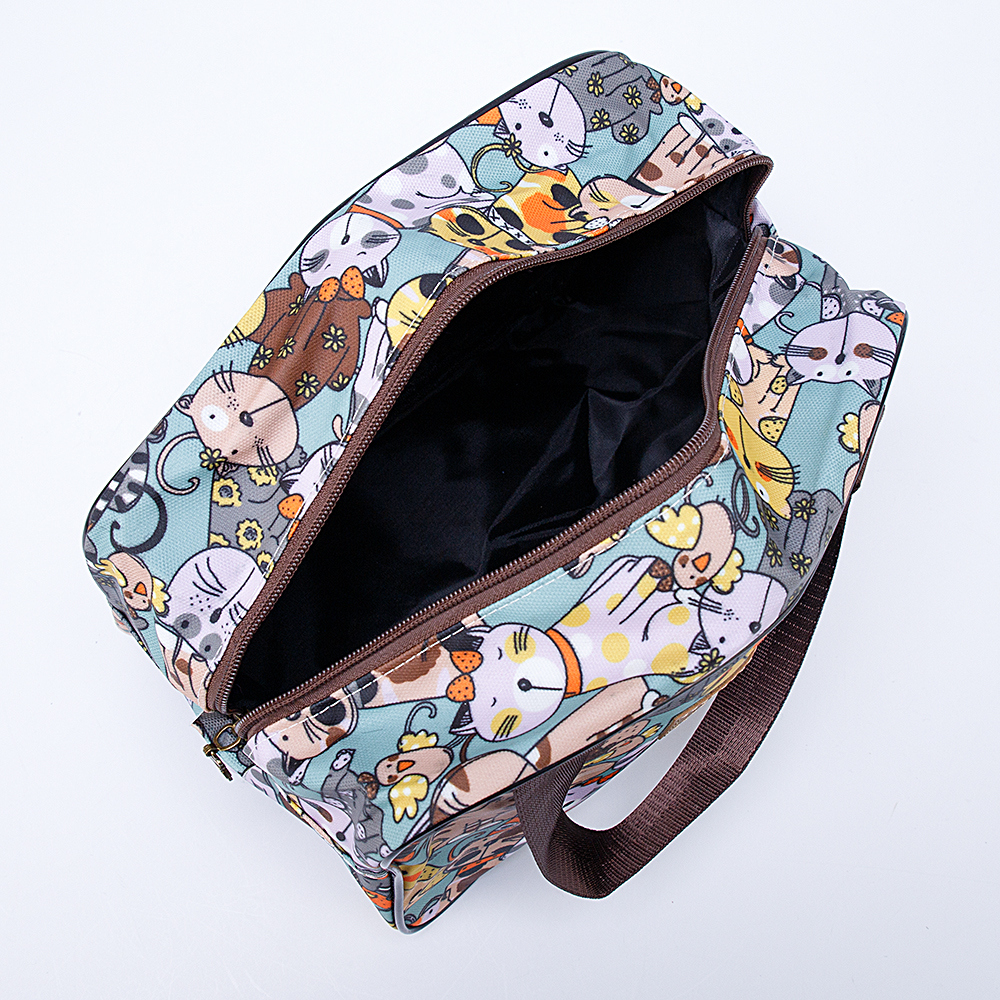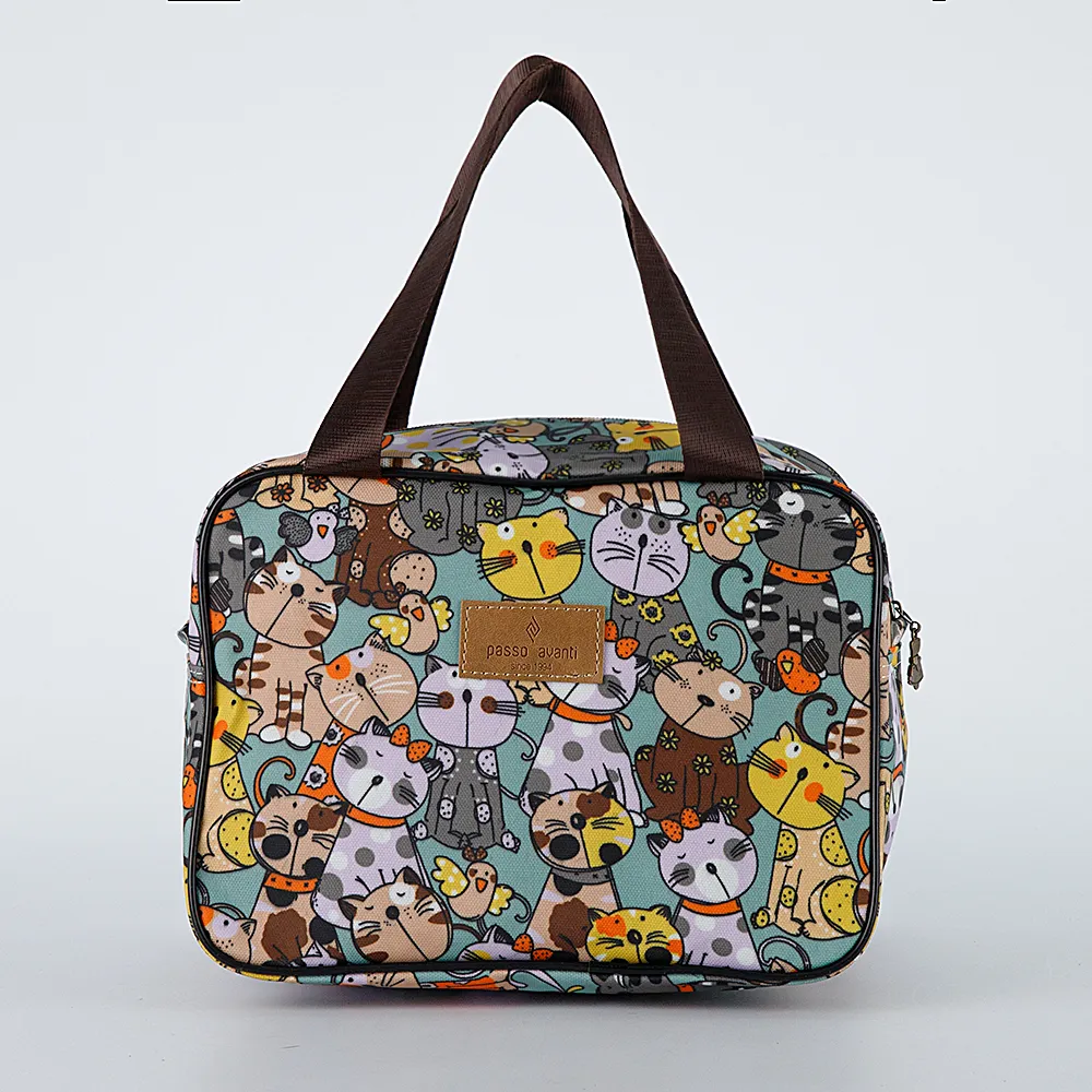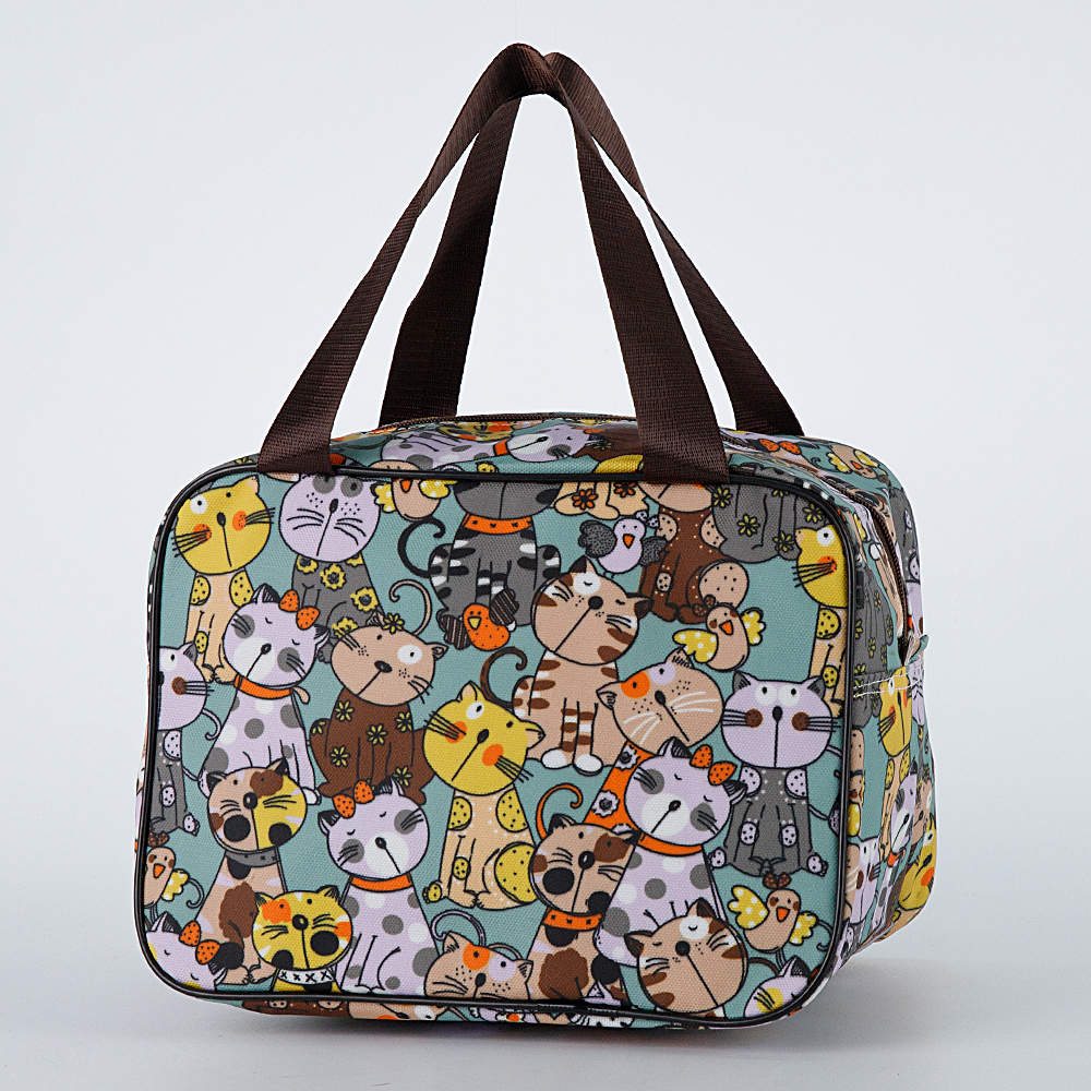 Косметичка от торговой марки Passo Avanti из текстильного материала с пропиткой в яркой расцветке с изображением кошек. Вместительная модель с двумя ручками из текстильного материала. Отделение на молнии. Внутри: текстильная подкладка.