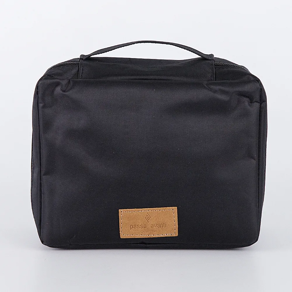 Косметичка от торговой марки Passo Avanti выполнена из текстильного материала черного цвета. Модель с одной ручкой-переноской. Отделение на молнии. Внутри: текстильная подкладка, сетчатый карман на молнии, съемная панель на липучке с объемным накладным карманом на резинке.