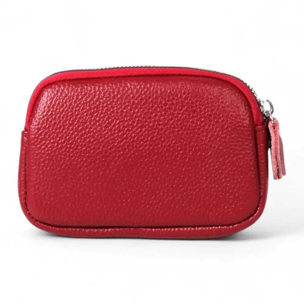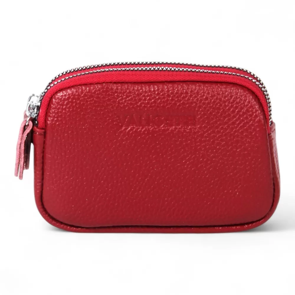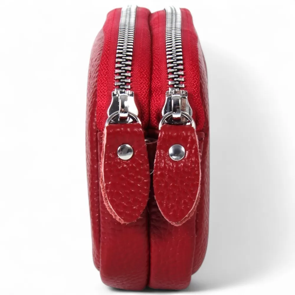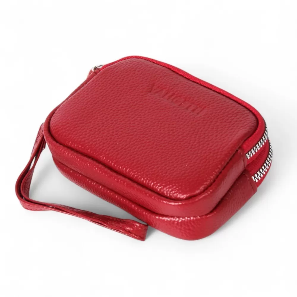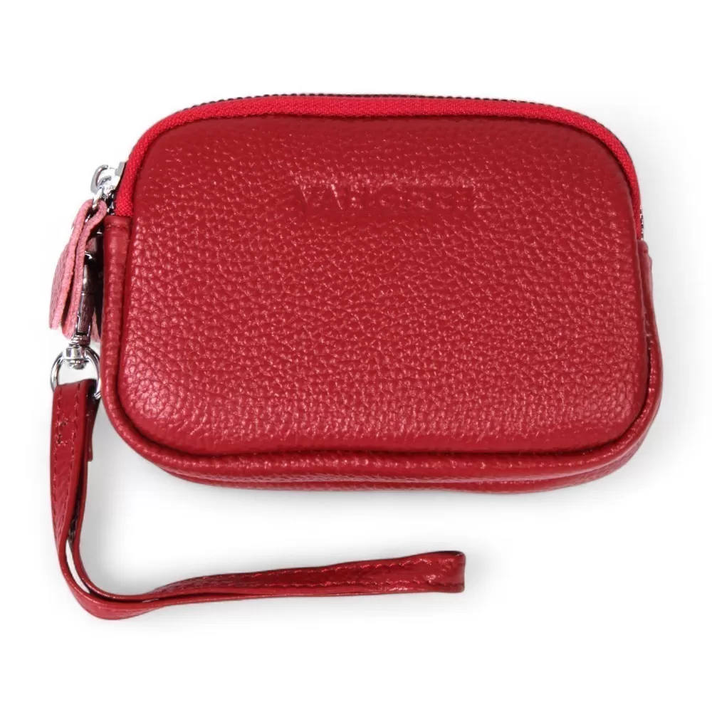 Кошелек от Valigetti сделан из натуральной бордовой кожи. Он имеет два отделения на молнии и короткий ремешок для ношения на запястье.
