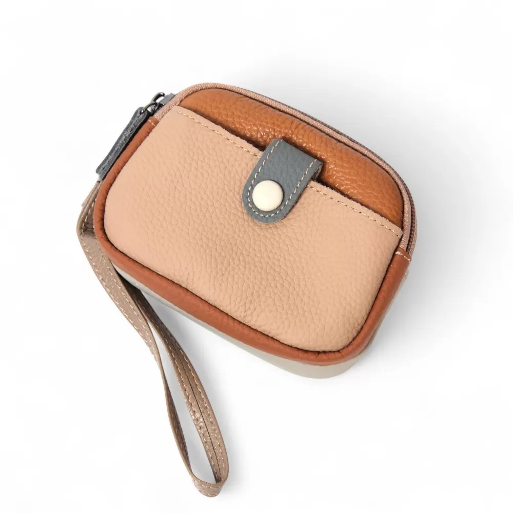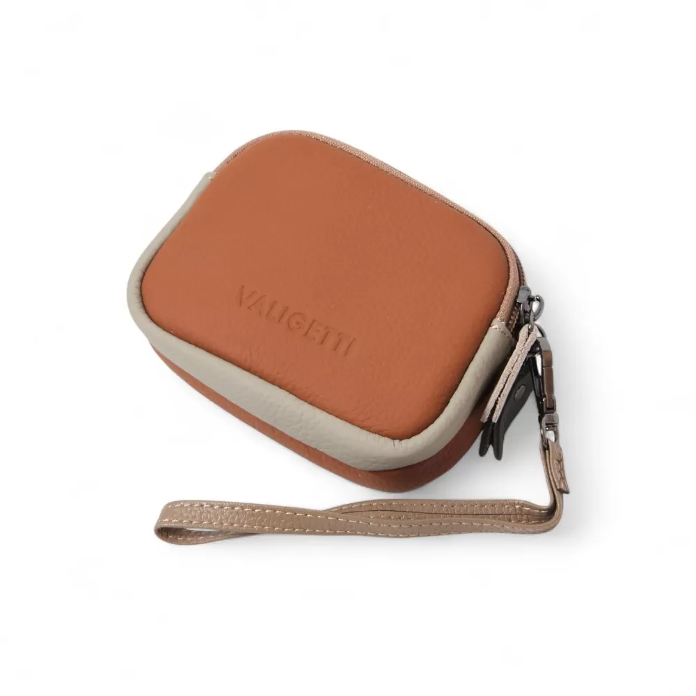 Мини-кошелек от Valigetti сделан из натуральной кожи. У него два отделения на молнии для карт и купюр, а также наружный карман с кнопкой. В комплекте — ремешок на запястье.