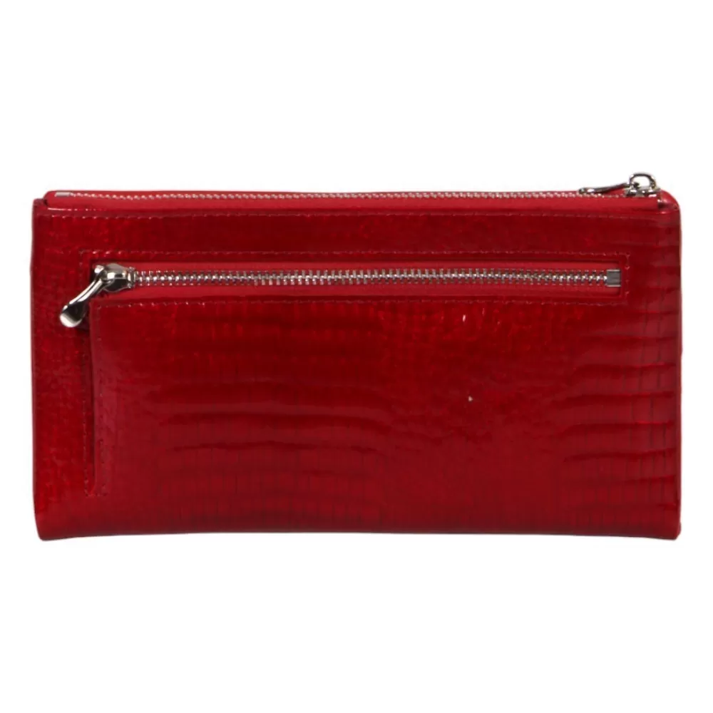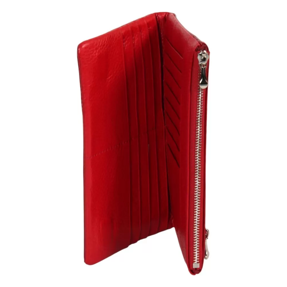Кошелёк от бренда Valigetti изготовлен из натуральной кожи и имеет насыщенный красный цвет. Модель открывается по типу книжки и фиксируется с помощью магнитов. Внутри предусмотрено 16 отделений для хранения карт, а также два глубоких кармана. Один из них расположен снаружи и закрывается на молнию, другой — на задней стороне кошелька.