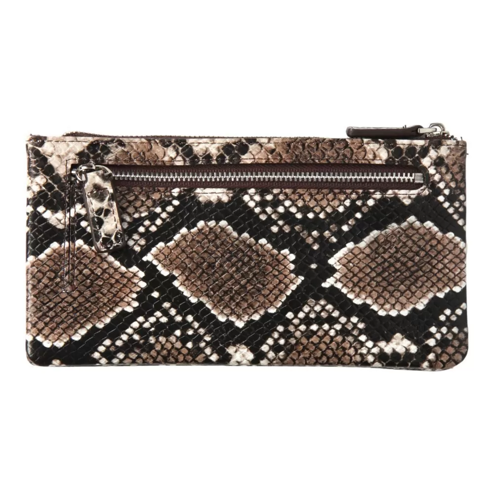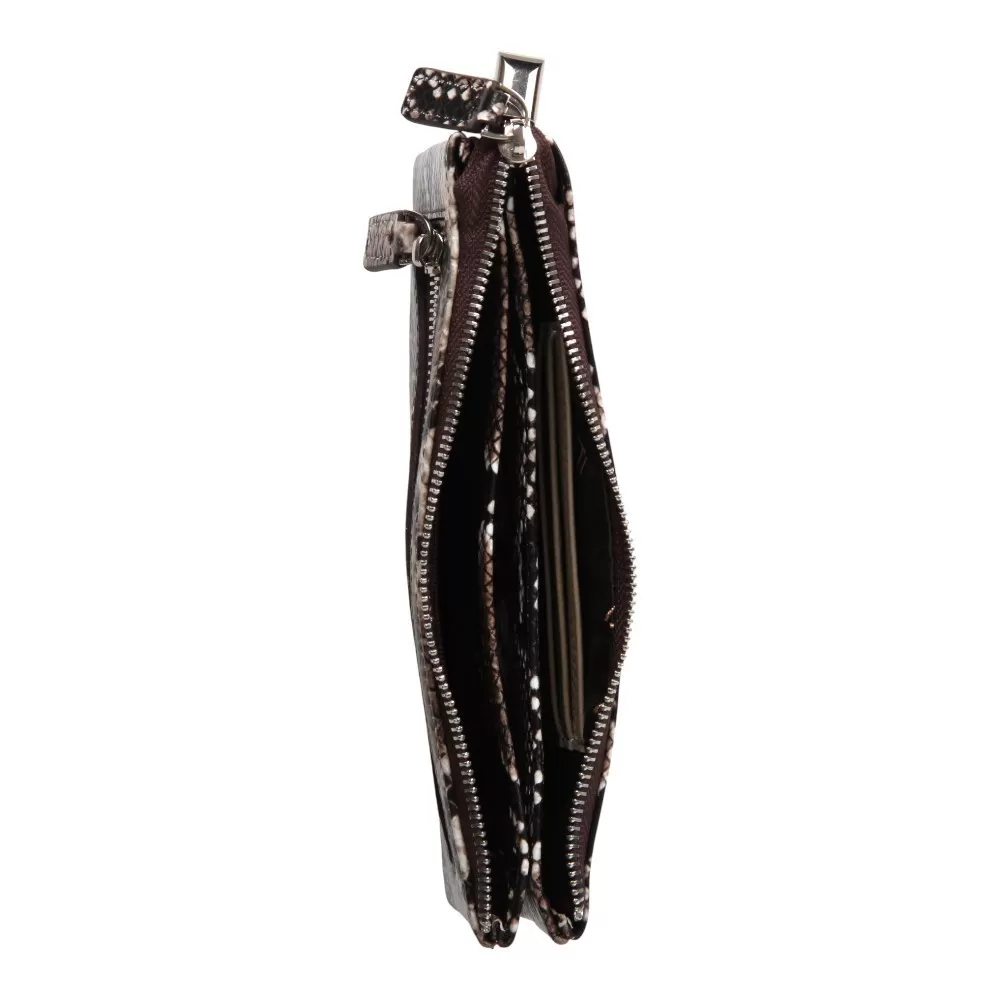 Кошелёк от бренда Valigetti изготовлен из натуральной кожи, кофейного цвета в стиле змеиной кожи. Модель имеет застежку на молнии. Внутри кошелек прошит фирменной подкладкой, а так же имеет 2 отделения, разделенных еще одним открытым отделением. Имеет 3 специальных отделения для карт и 1 внутренний карман на молнии. Снаружи так же есть еще 1 карман на молнии.