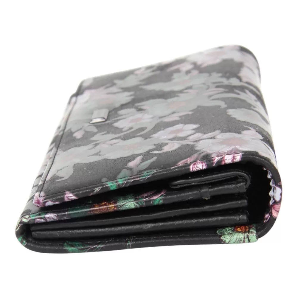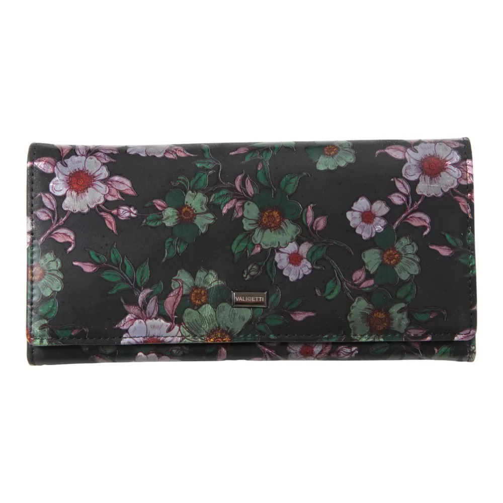 Кошелёк от бренда Valigetti изготовлен из натуральной кожи, черного цвета, украшенный цветочно-растительным орнаментом. Кошелек имеет фирменную подкладку и застегивается клапаном на магнитах. Модель имеет 3 отделения, разделенные двумя кармашками на молнии, так же дополнительно 2 отделения для купюр и 5 отделений для карт. Снаружи так же есть еще 1 карман на молнии.