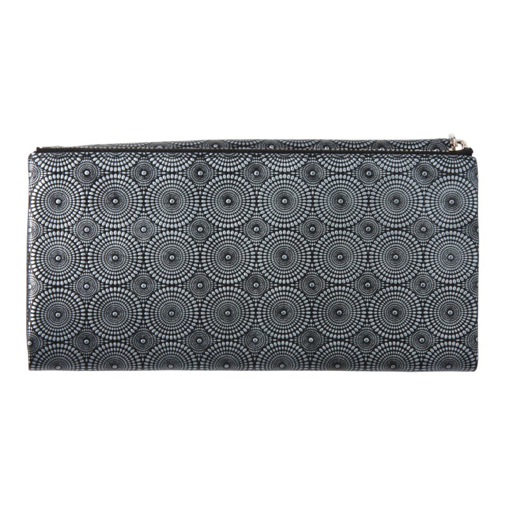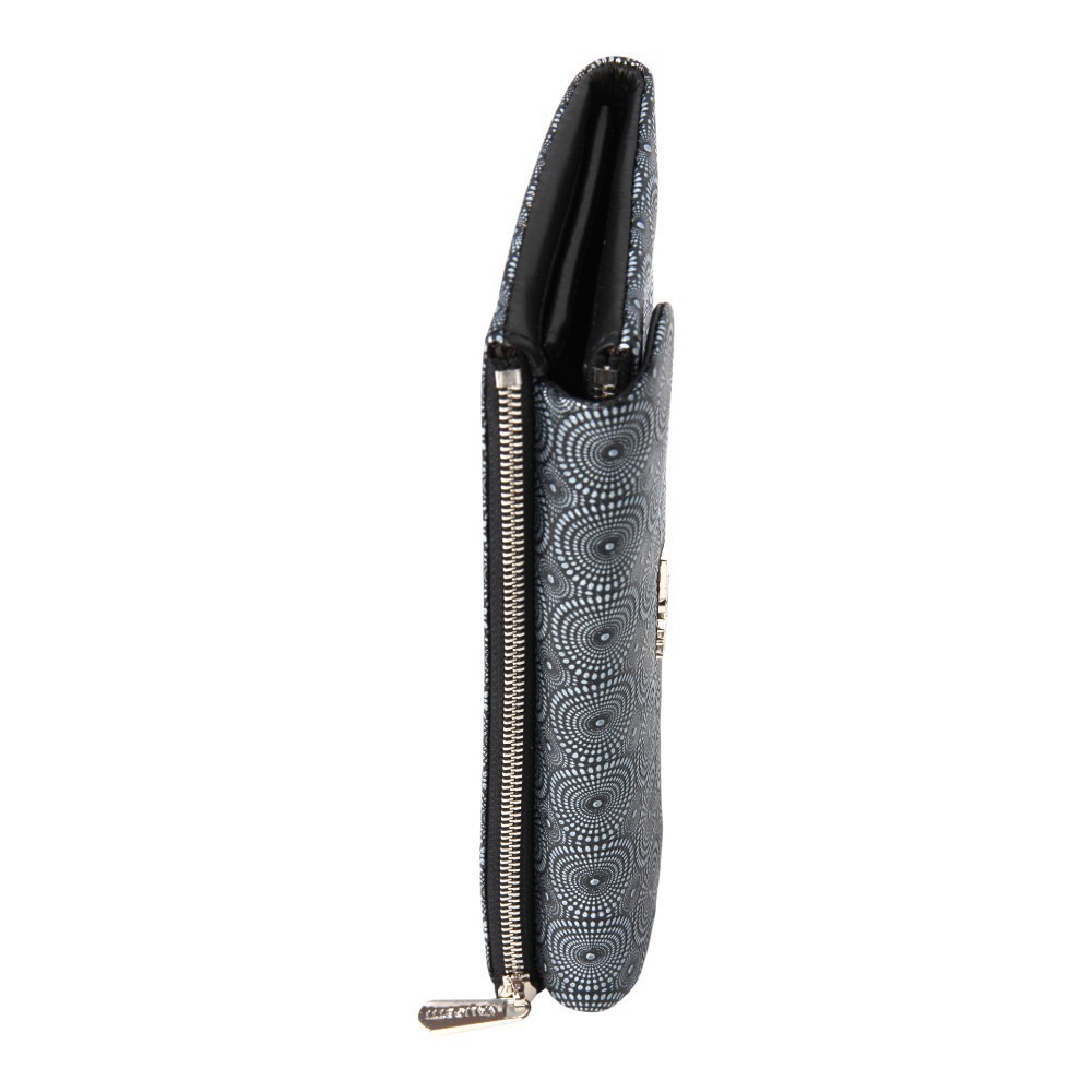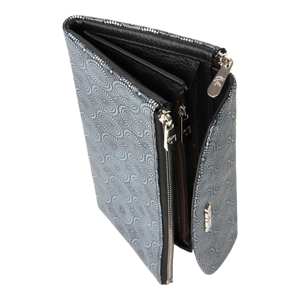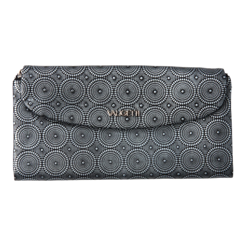 Кошелёк от бренда Valigetti изготовлен из натуральной кожи, серого цвета с красивым узором. Модель имеет 2 отделения : одно имеет застежку на молнии, а второе закрывается на замок-клапан с магнитами. Внутри кошелек прошит фирменной подкладкой, имеет 8 специальных отделений для карт и 1 карман на молнии.