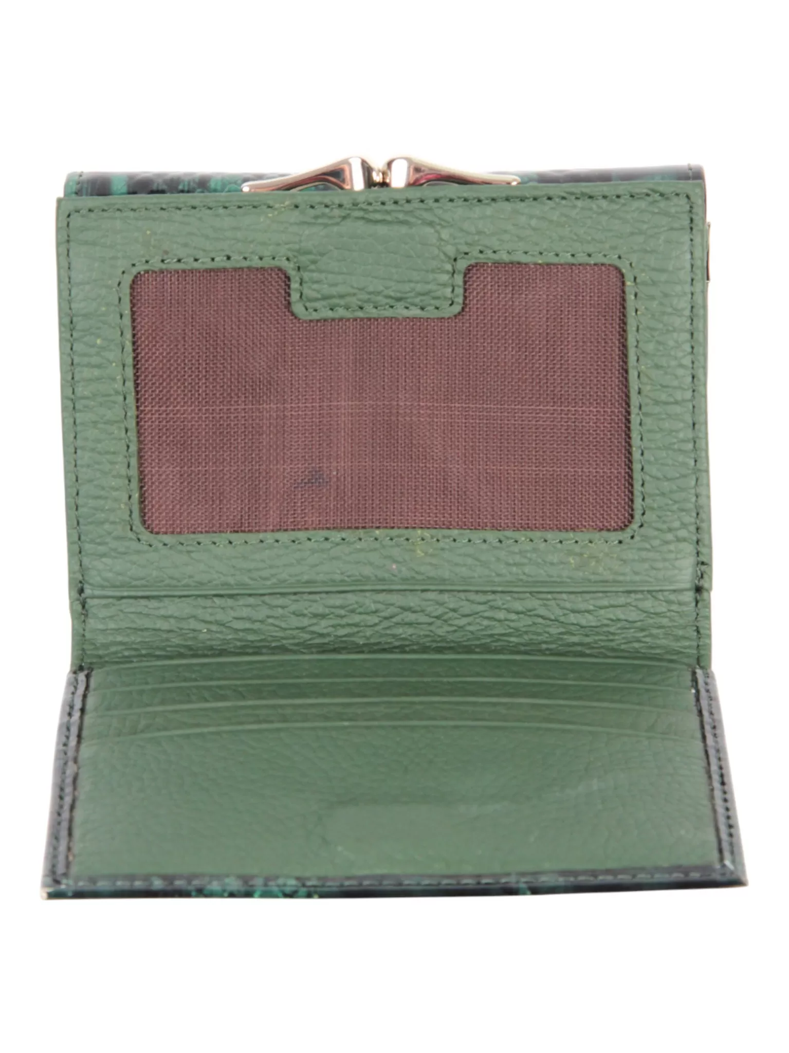 Кошелёк от бренда Valigetti изготовлен из натуральной кожи, зеленого цвета с узором в стиле змеиной кожи. У данной модели 2 отделения : одно небольшое и закрывается на замок-фермуар, а второе на клапан-магнит. Внутри у кошелька есть большое отделение для купюр, кармашек для документов, кармашек для мелочи и 6 специальных отделений для карточек.