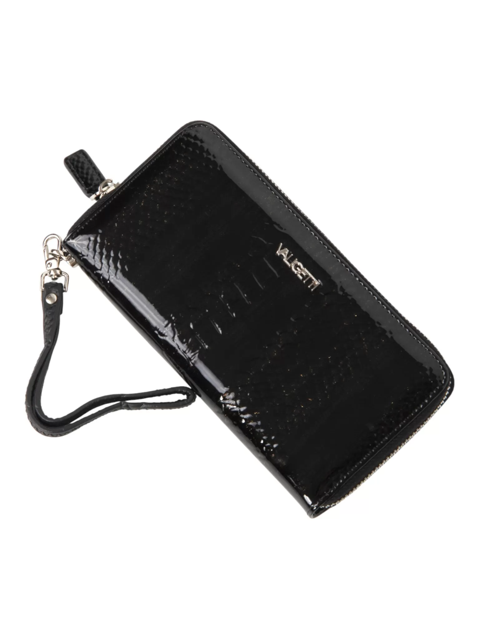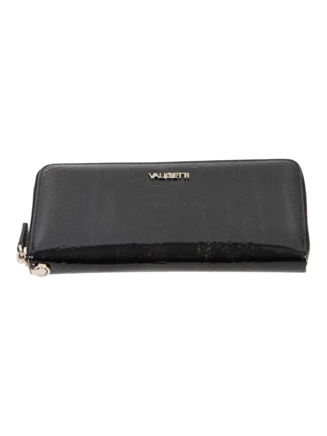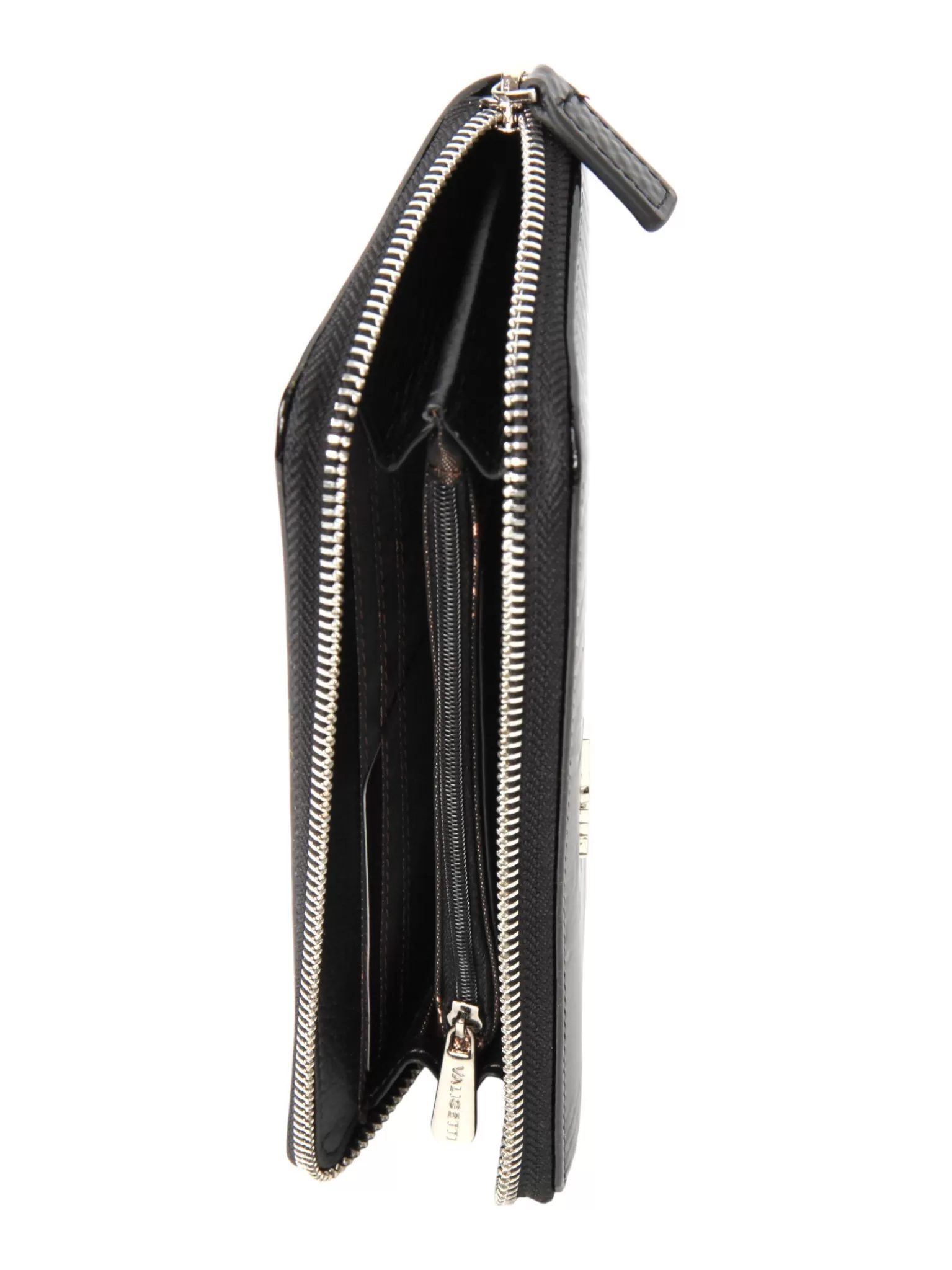 Кошелёк в черном цвете от бренда Valigetti изготовлен из натуральной кожи. Модель имеет застежку на молнии. В комплекте идет ремешок, который позволит носить кошелек на запястье. Внутри кошелек прошит фирменной подкладкой и имеет одно большое отделение, разделенное кармашком на молнии и 8 специальных отделений для карточек.