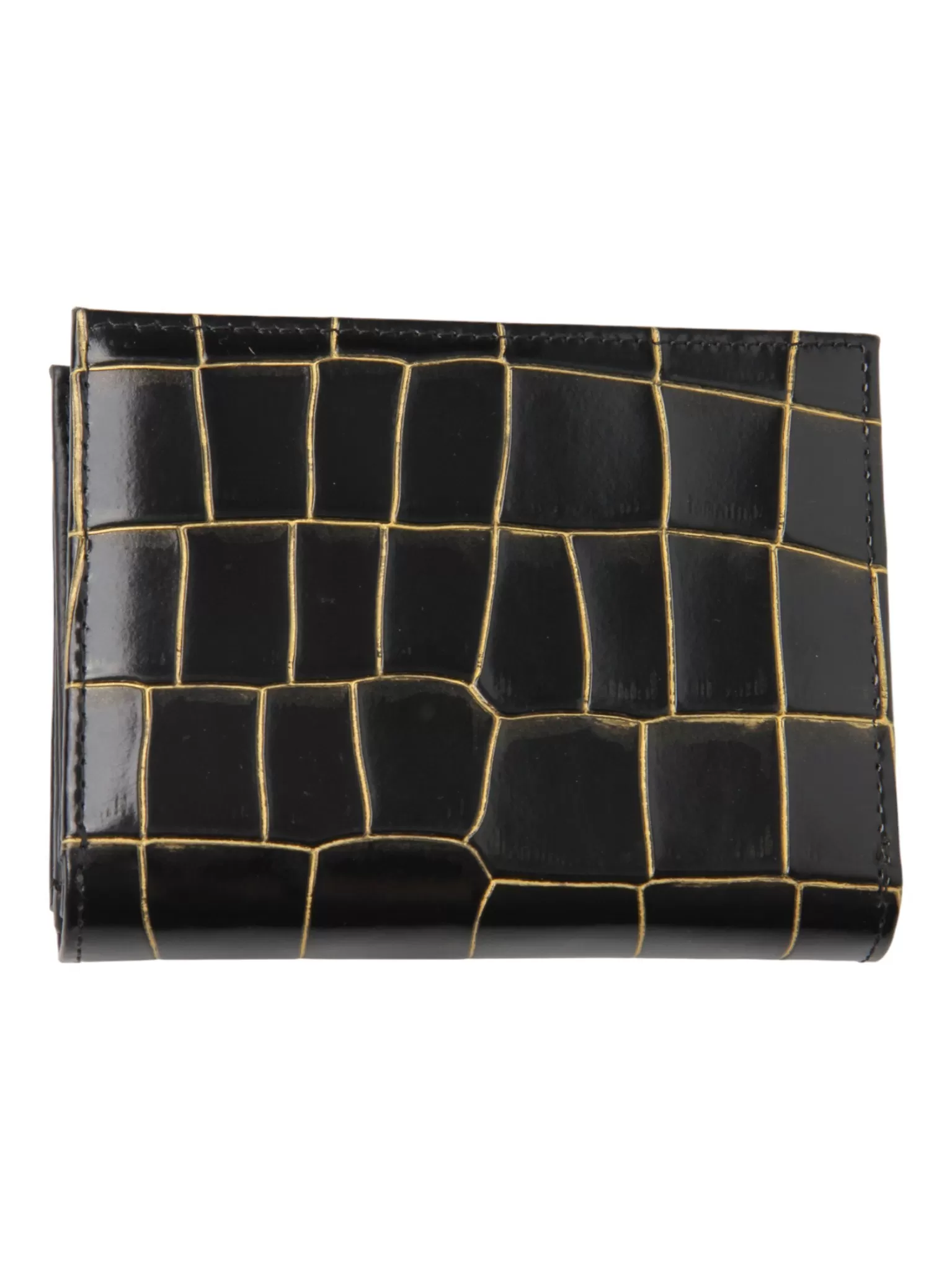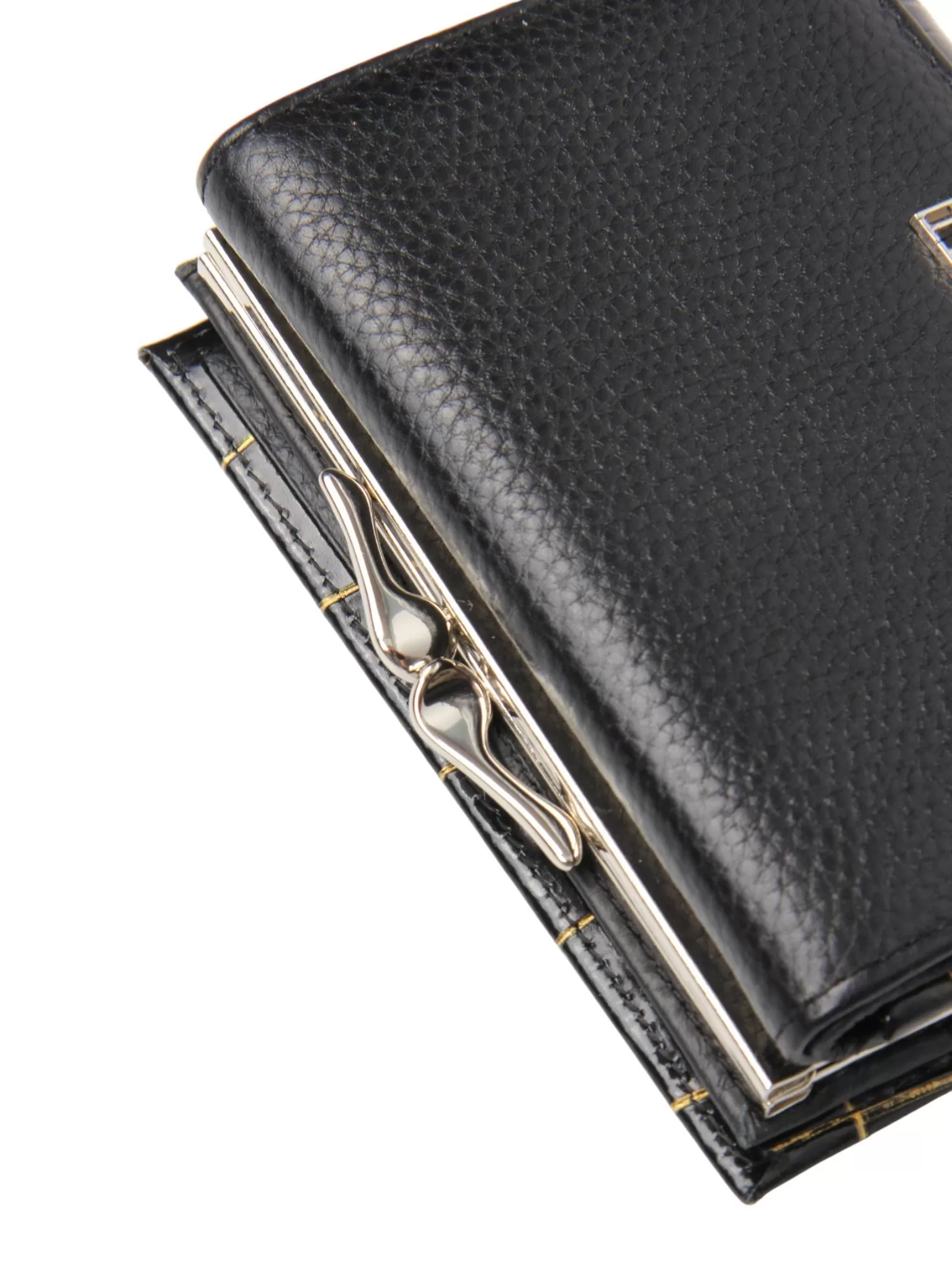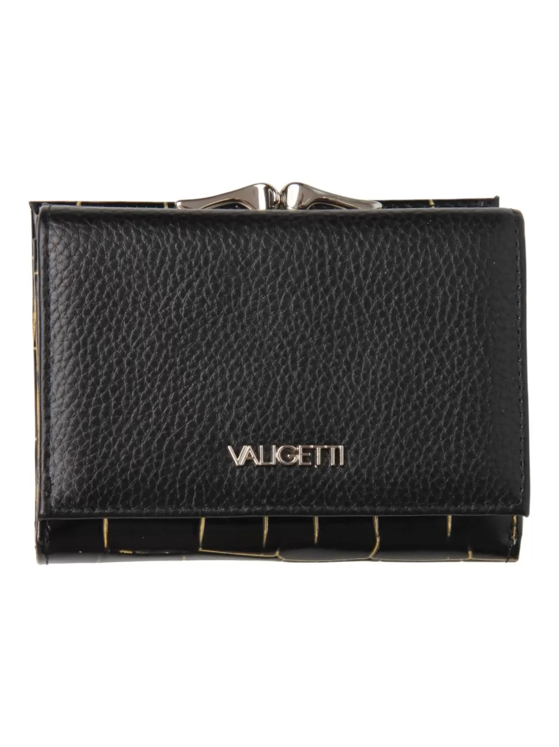 Кошелёк от бренда Valigetti изготовлен из натуральной кожи, черного цвета с узором в зернистом стиле. У данной модели 2 отделения : одно небольшое и закрывается на замок-фермуар, а второе на клапан-магнит. Внутри у кошелька есть большое отделение для купюр, кармашек для документов, кармашек для мелочи, 6 специальных отделений для карточек и кармашек для мелочи.