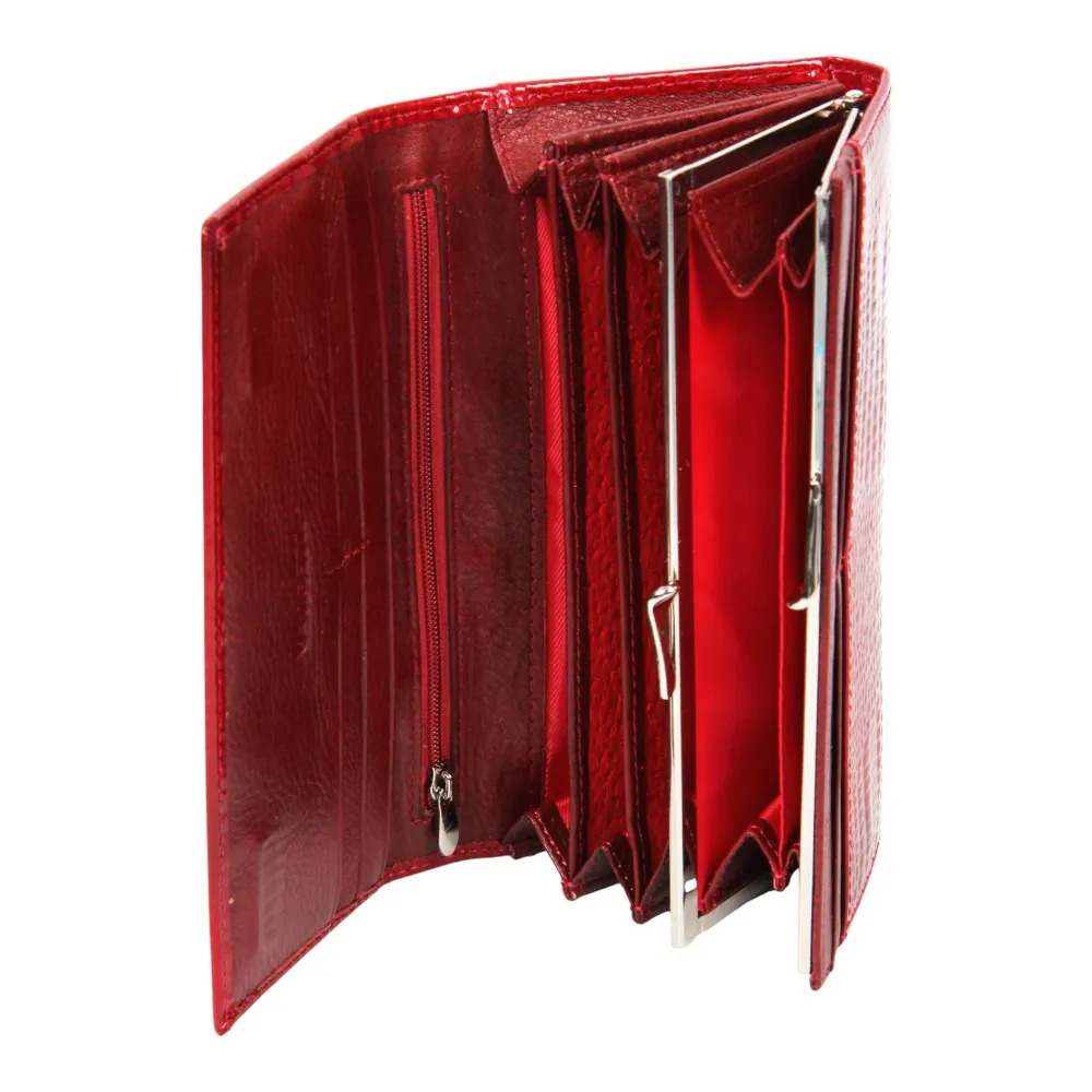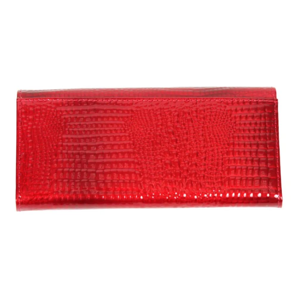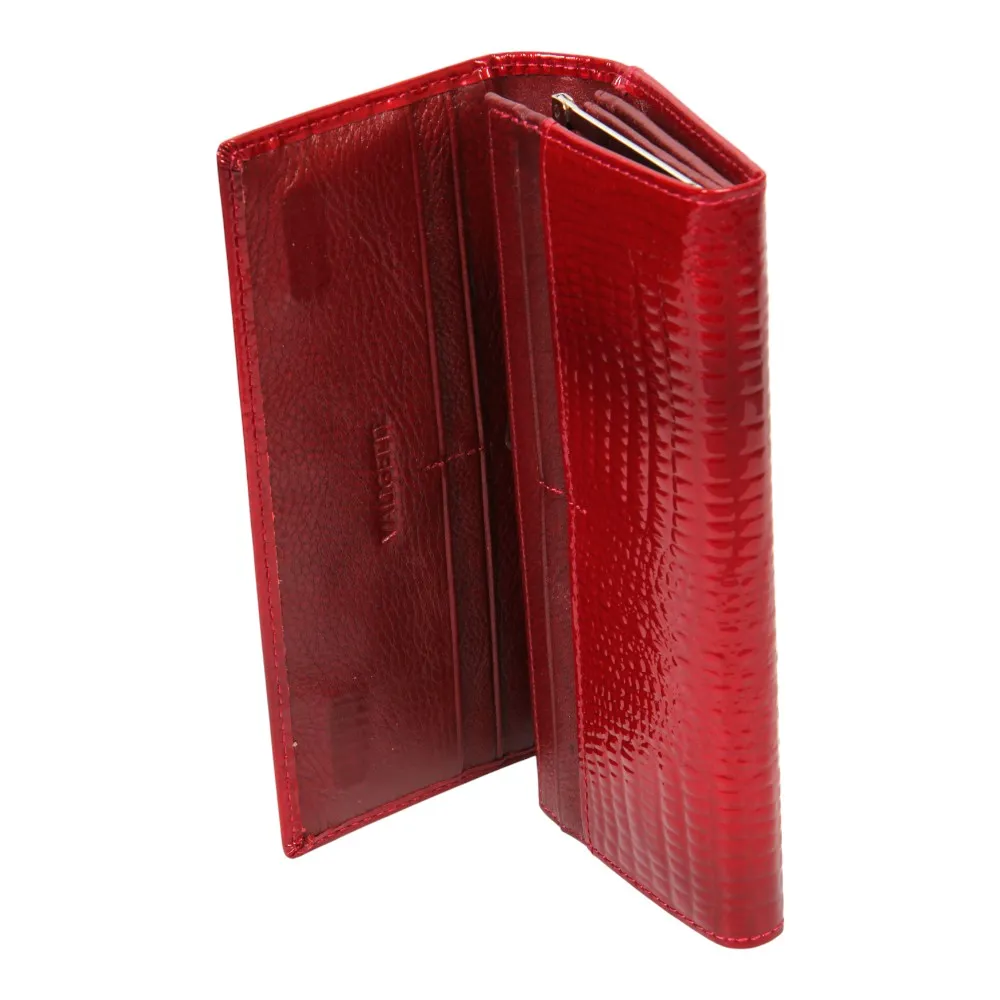 Кошелёк в красном цвете от бренда Valigetti изготовлен из натуральной кожи с узором из змеиной кожи. Снаружи есть открытый кармашек. Кошелек закрывается на клапан-магнит и имеет внутри 2 отделения : одно разделено двумя перегородками и имеет 1 карман на молнии и 6 специальных отделений для карт. а второе закрывается на замок фермуар и так же разделен перегородкой. Кошелек прошит фирменной подкладкой Valigetti.