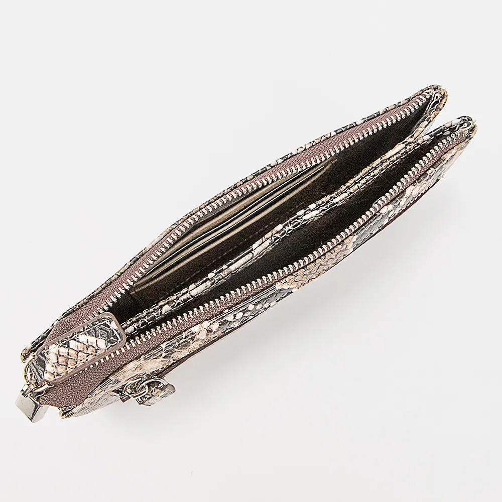 Клатч от торговой марки Francesco Molinary из натуральной лакированной кожи черного цвета с тиснением под рептилию. Модель со съемным ремешком для запястья. Закрывается молнией. Внутри: два отсека, в одном из которых – карманы для карт, в другом – карман на молнии. На задней стороне – карман на молнии.