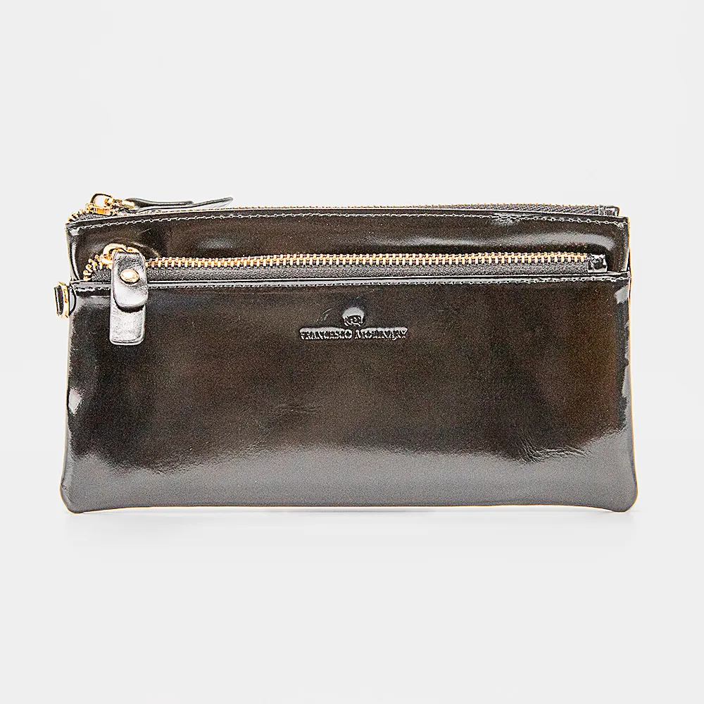 Клатч от торговой марки Francesco Molinary из натуральной кожи бордового цвета. Модель с ремешком для запястья. Отделение на молнии. Внутри: текстильная подкладка, накладной карман с карманами для карт. На лицевой и задней сторонах – карман на молнии.