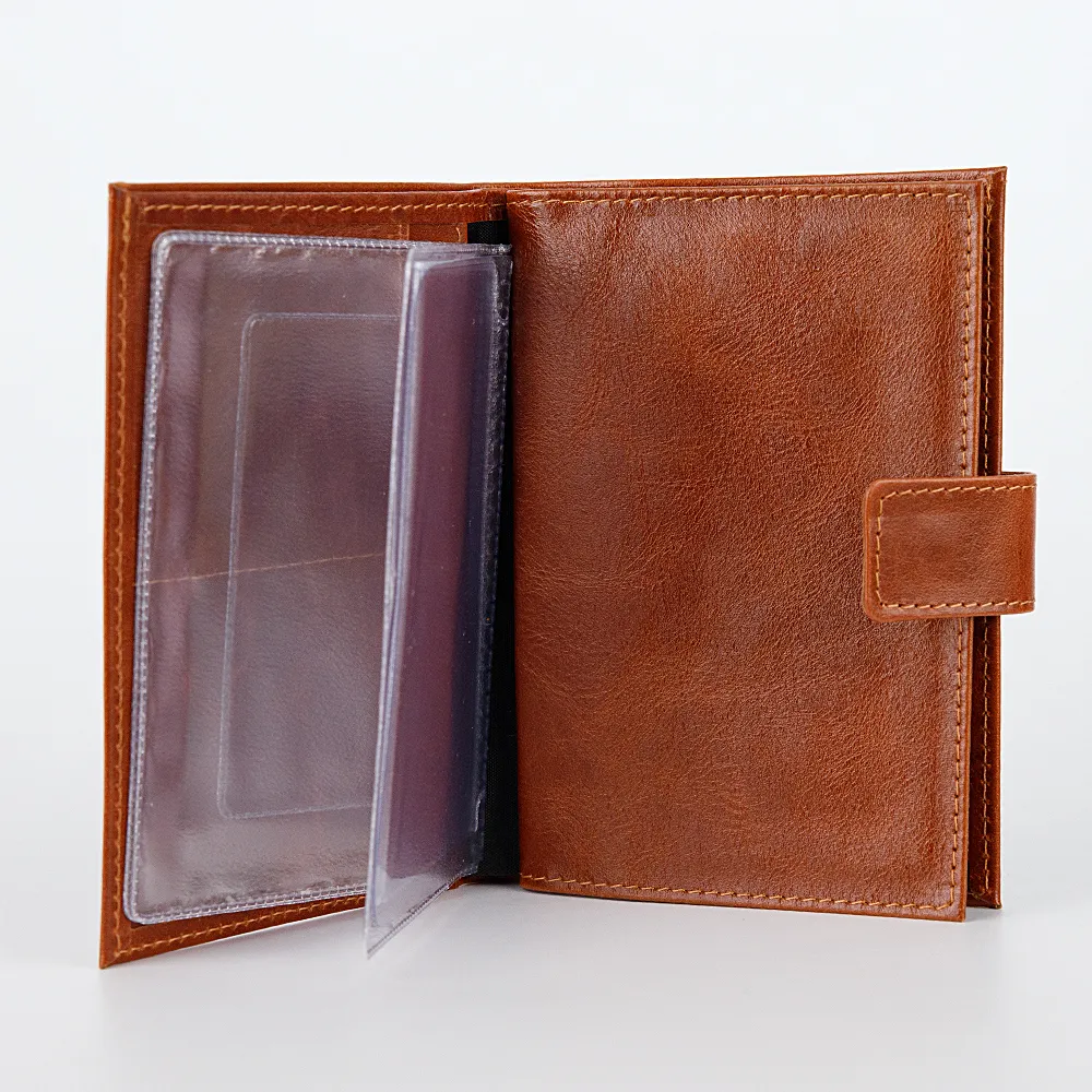 Бумажник от торговой марки Poshete изготовлен из натуральной зернистой кожи черного цвета. Модель для паспорта и автодокументов закрывается хлястиком на кнопку, раскрывается книжкой. Внутри: два отсека, разделенных перегородкой. В одном – съемный блок-вкладыш из прозрачных файлов для документов водителя разного формата, в другом – два клапана для паспорта. Имеется глубокое отделение для документов.