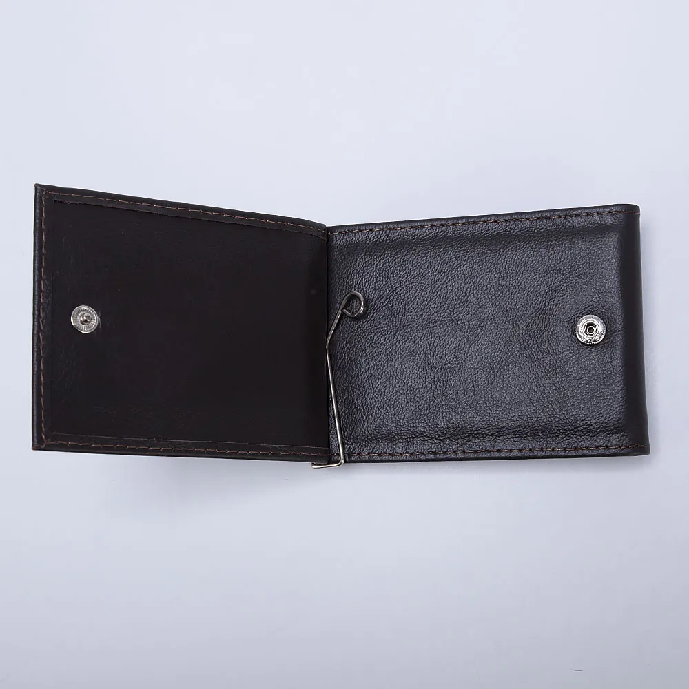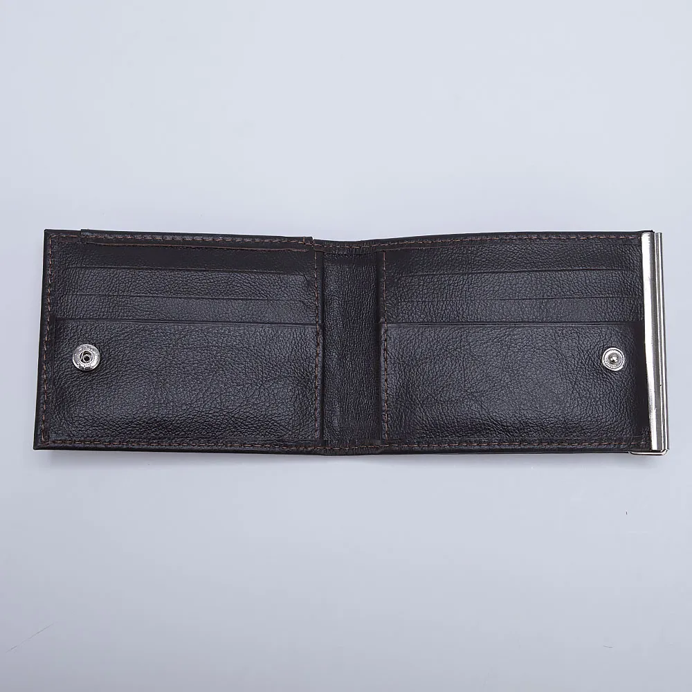 Зажим для денег от торговой марки Poshete из натуральной кожи коричневого цвета. Функциональная модель с двумя разворотами, которые фиксируются кнопкой. Один из разворотов с металлической скрепкой предназначен для купюр, второй разворот с шестью карманами для пластиковых карт и двумя внутренними карманами. Снаружи имеется карман для монет с клапаном на кнопке.