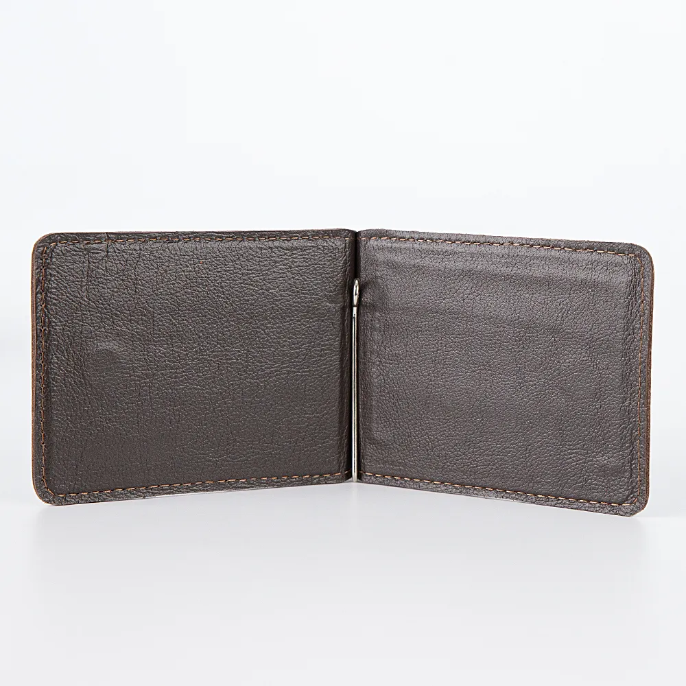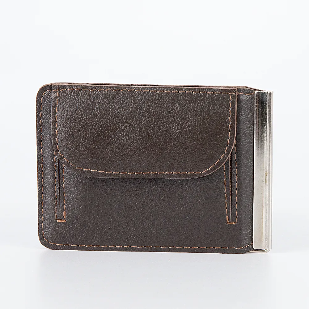Классический зажим для денег от Poshete выполнен в темно-коричневом цвете из натурально кожи с естественной фактурой и дополнен серебристой металлической фурнитурой. Модель имеет отдельный карман для монет на кнопке.