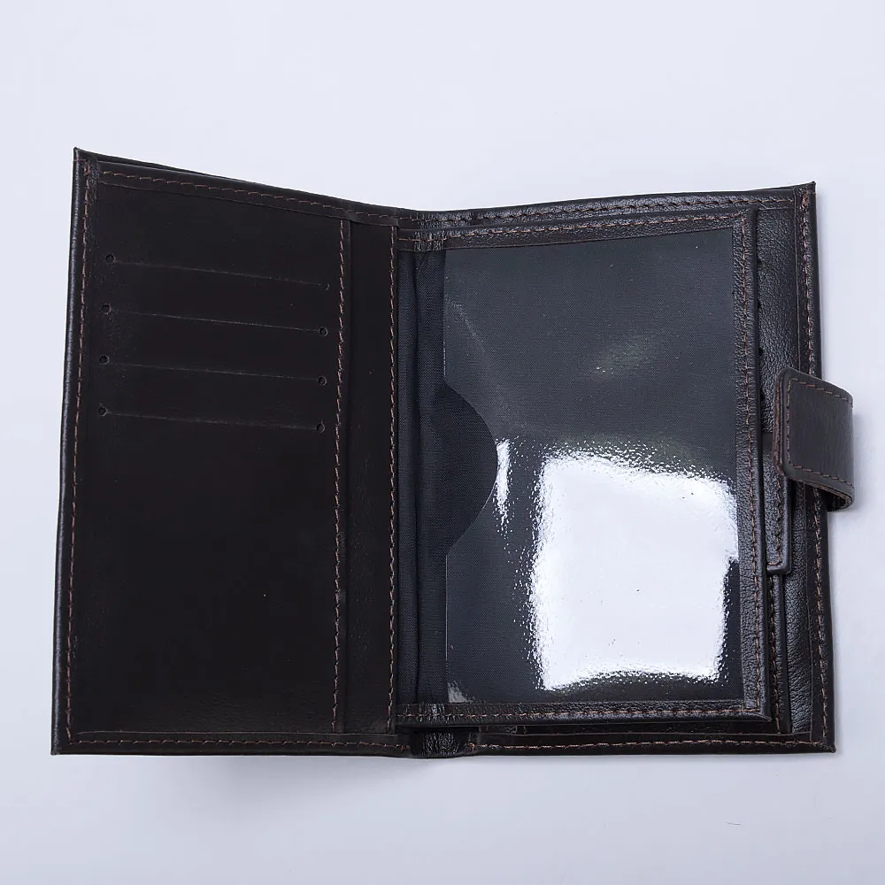 Бумажник от торговой марки Poshete из натуральной зернистой кожи коричневого цвета. Закрывается хлястиком на кнопке; раскрывается книжкой. Внутри: глубокое отделение для документов, карманы для карт, перегородка с двумя прозрачными карманами; имеется карман для монет с клапаном на кнопке.