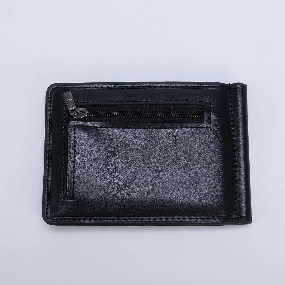 Зажим для денег Poshete чёрного цвета, выполнен из искусственной кожи. Внутри по центру металлический зажим, справа накладной карман без застёжки, подходит для пластиковых карт. Снаружи карман на молнии для монет. Зажим складывается пополам, раскрывается книжкой, без застёжки.
