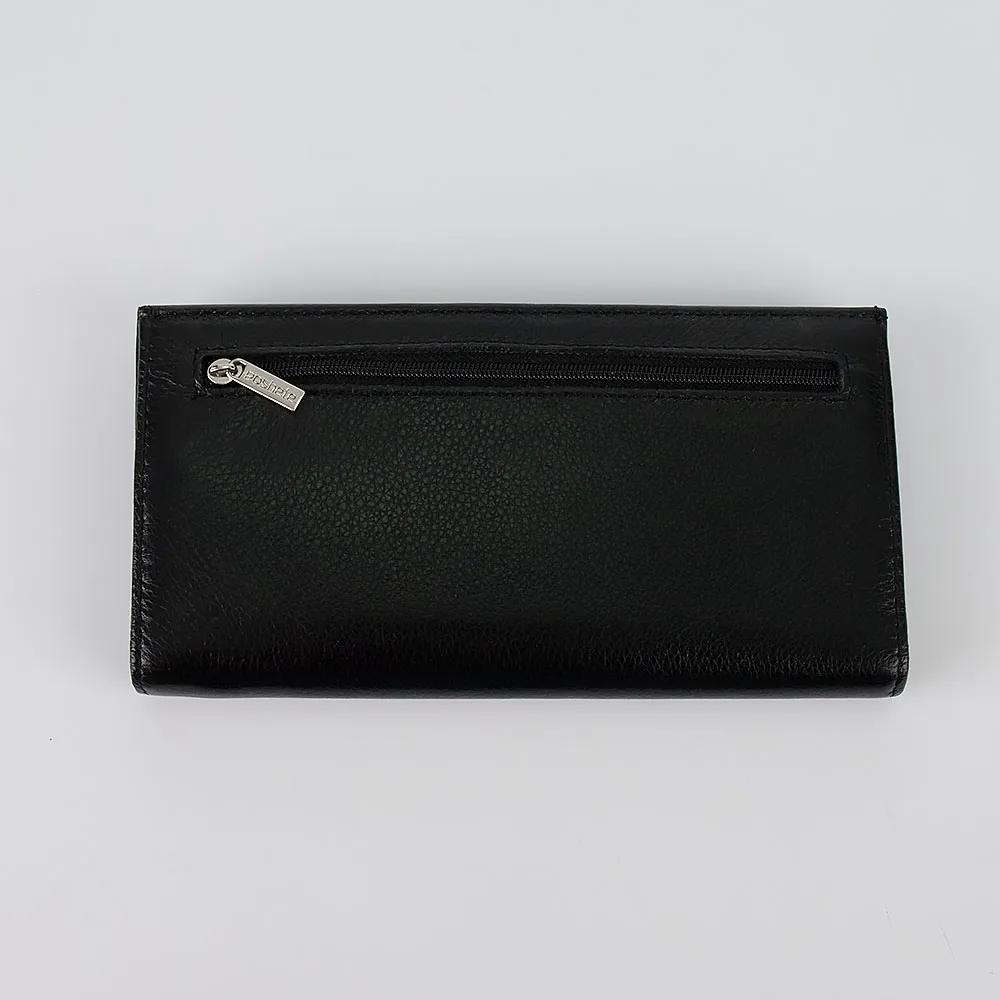 Универсальный кошелёк от бренда Poshete стильный и удобный в использовании благодаря фиксации на магниты, с отличным качеством отделки. Раскрывается книжкой, внутри отделения для купюр с текстильной подкладкой, карман на молнии, двенадцать кармашков для карточек и кармашек-окошко. Выполнен из натуральной кожи в чёрном цвете.