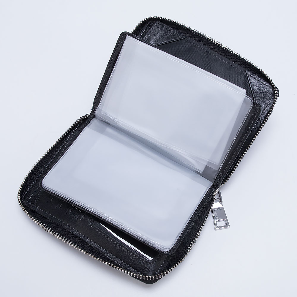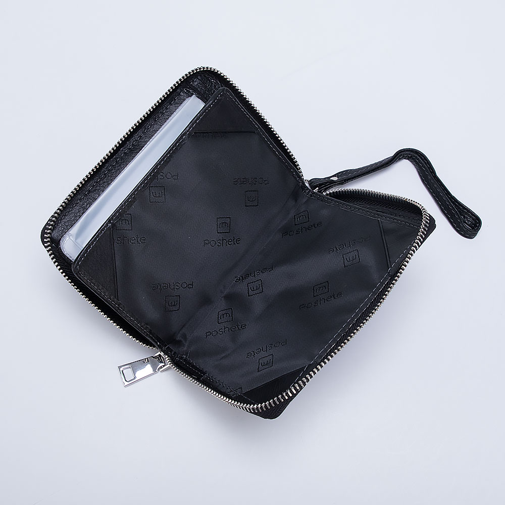 Бумажник от бренда Poshete выполнен из натуральной кожи черного цвета. Модель на молнии, со съемным ремешком для запястья. Внутри: файлы для документов, карманы для карт и сим-карт, карман-окошко. На задней стороне – карман на молнии. Передняя сторона декорирована тиснением с названием бренда.