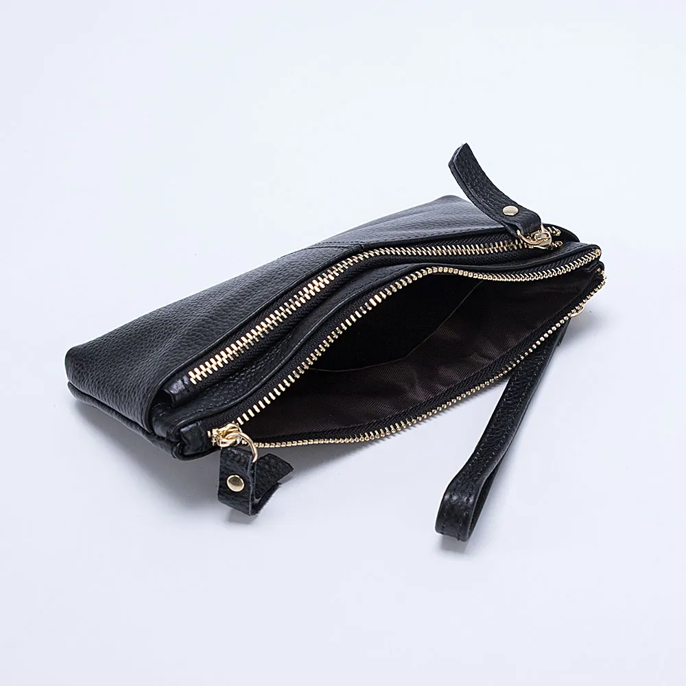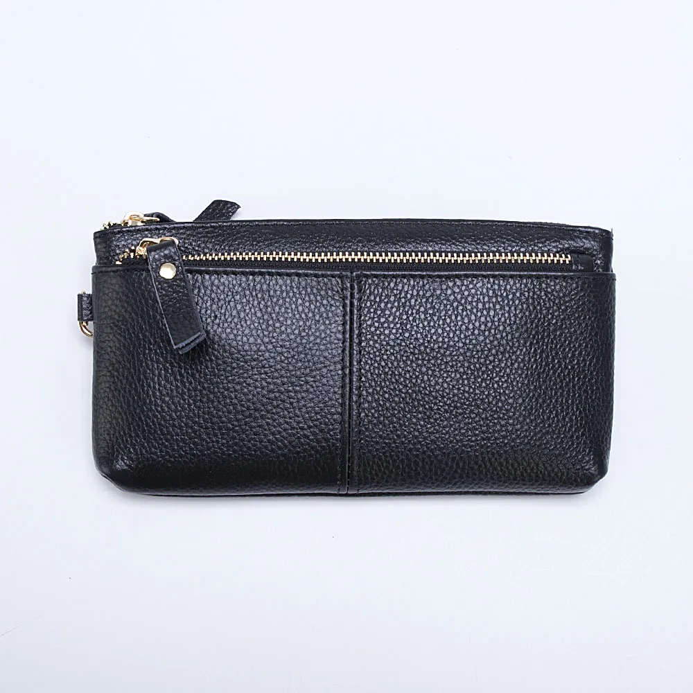 Стильный полноразмерный кошелек от бренда Poshete изготовлен из натуральной кожи черного цвета. Модель с двумя отделениями на молнии, с текстильной подкладкой. На лицевой стороне – прорезной карман на молнии. Кошелек можно носить как в сумке, так и в руке: в комплекте имеется съемный ремешок на запястье. Молнии удобно расстегивать благодаря кожаным пуллерам.