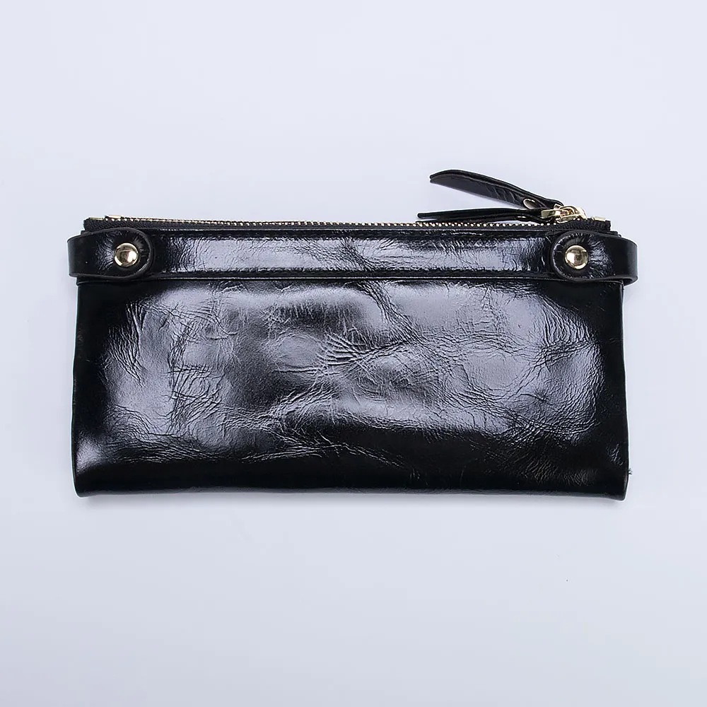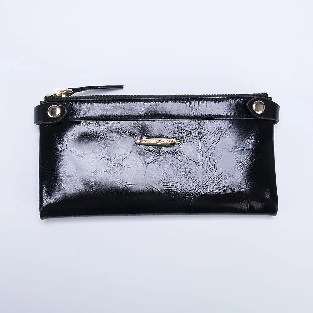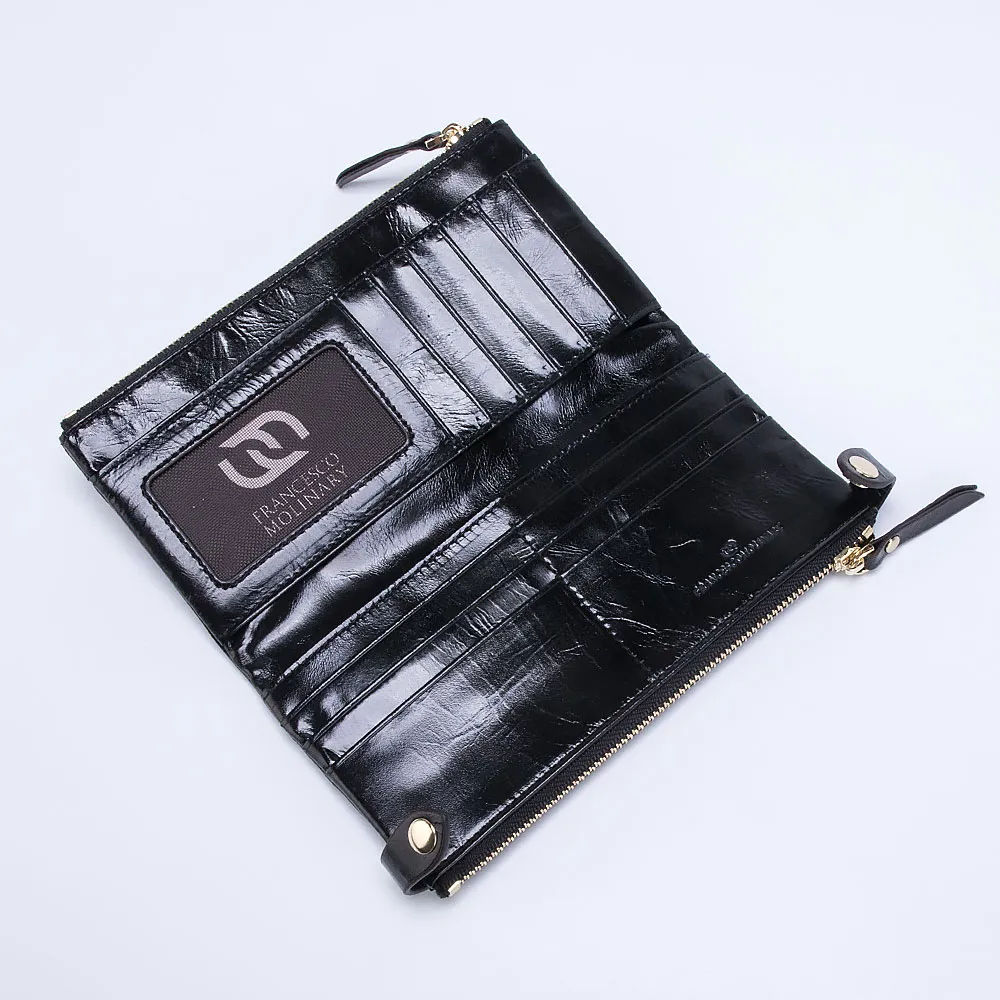 Большой женский кошелёк в ретро стиле от бренда Francesco Molinary выполнен из натуральной кожи в сочетании с золотистой металлической фурнитурой и несомненно украсит вашу сумочку. Модель чёрного цвета с эффектом помятости и лоска. Закрывается двумя короткими ремешками по бокам на кнопках, раскрывается книжкой, внутри три отделения для купюр и двенадцать кармашков для карточек, один из которых прозрачный. Снаружи два отделения на молниях для монет.
