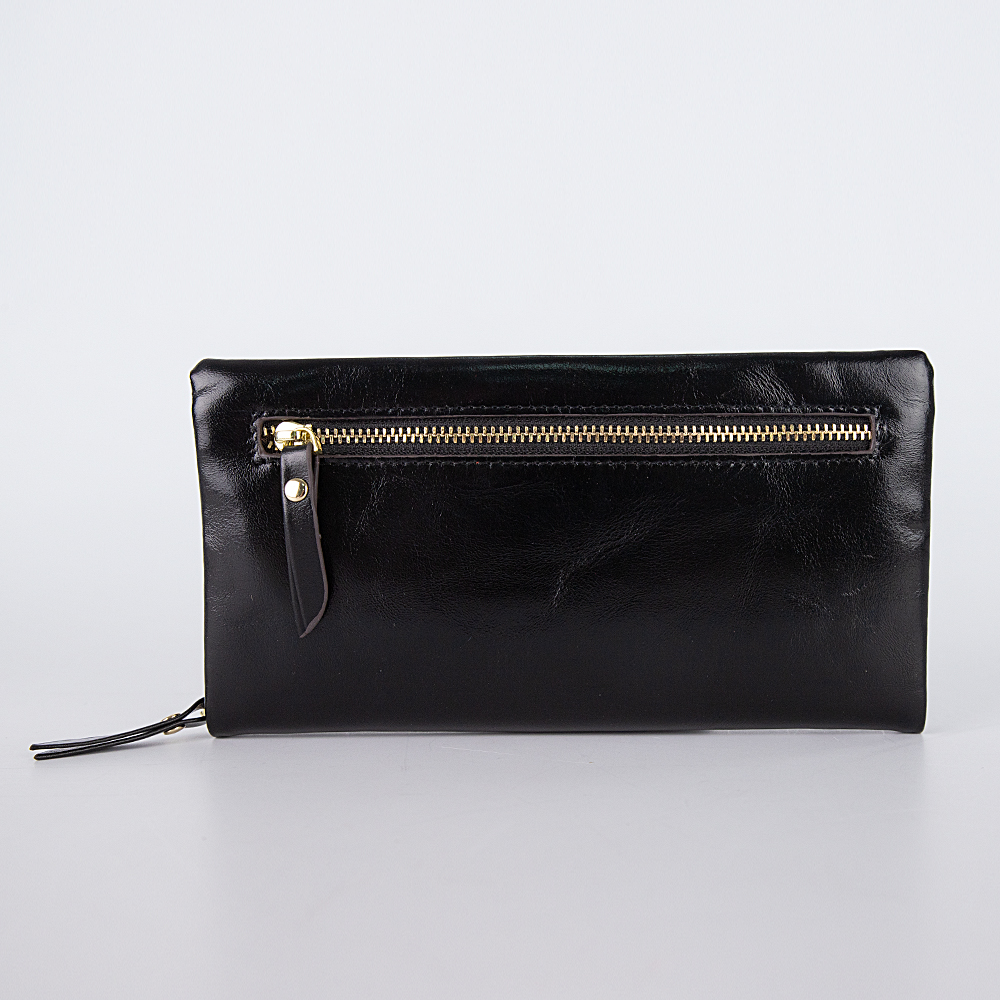 Большой женский кошелёк в ретро стиле от бренда Francesco Molinary выполнен из натуральной кожи в сочетании с золотистой металлической фурнитурой и несомненно украсит вашу сумочку. Модель чёрного цвета с эффектом помятости и лоска. Закрывается на молнию, внутри четыре отсека для купюр, средник на молнии, шесть кармашков для карточек и один кармашек-окошко. Снаружи карман на молнии для монет.