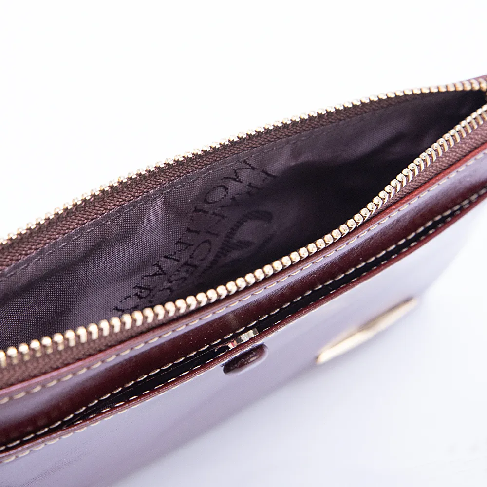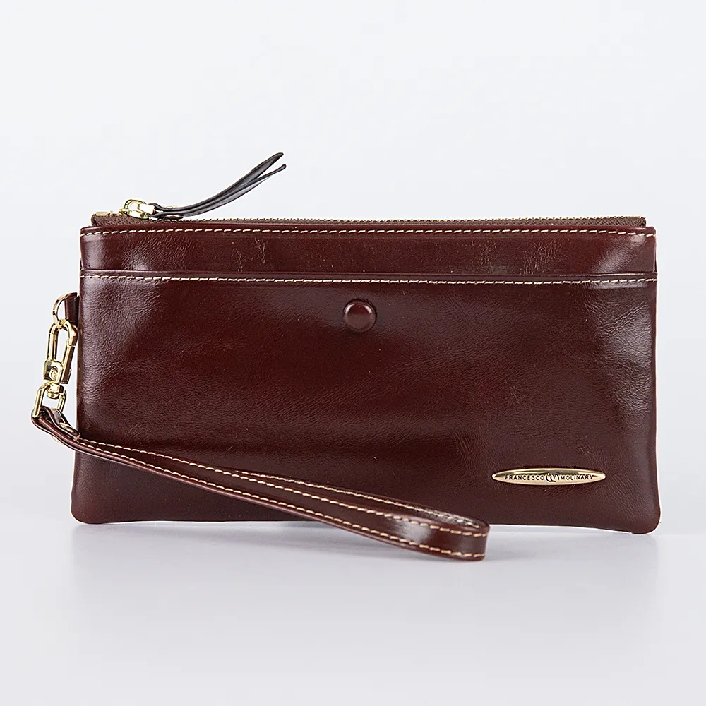 Кошелёк-клатч из коллекции в ретро стиле от бренда Francesco Molinary выполнен из натуральной кожи в сочетании с золотистой металлической фурнитурой и несомненно украсит вашу сумочку. Модель коричневого цвета со стилизацией помятости и лоска. Застёгивается на молнию, внутри шоколадного цвета подкладка и накладной карман. Снаружи дополнен ремешком для запястья и карманом на кнопке.