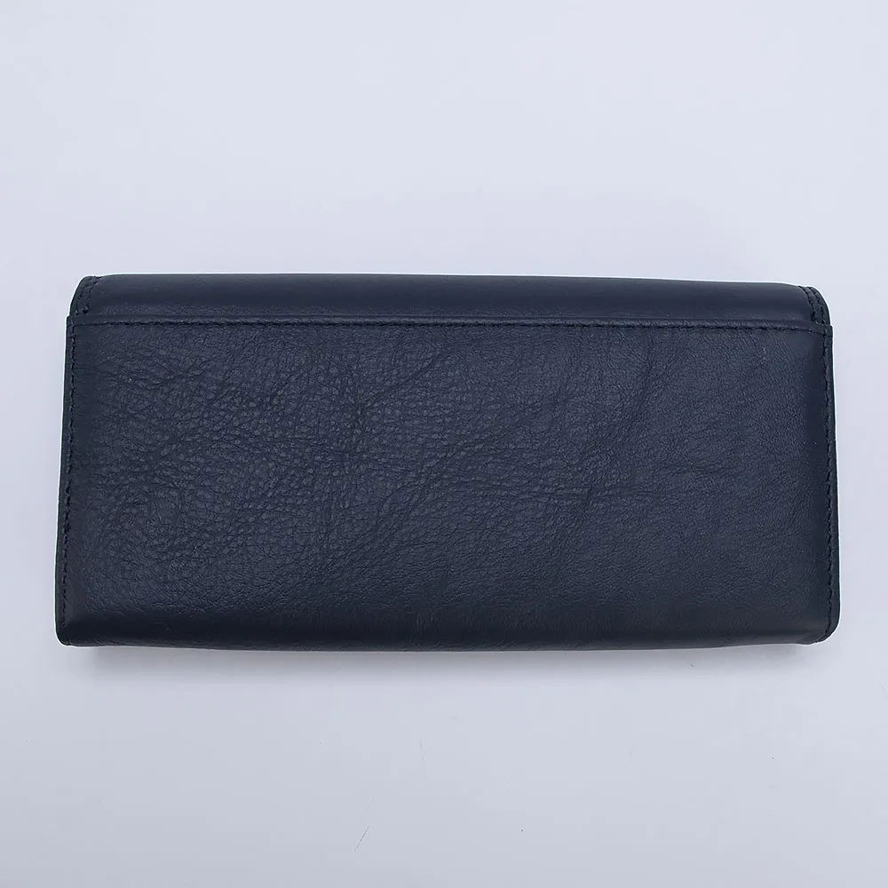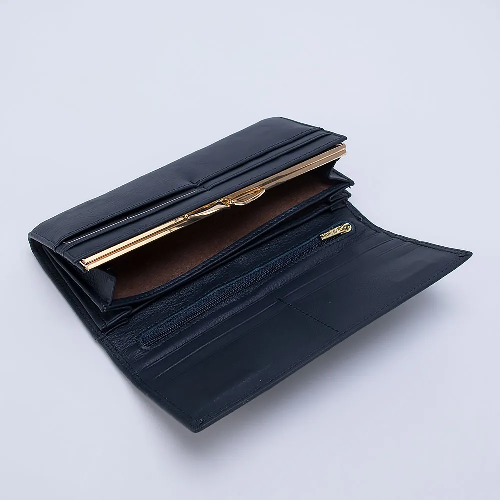 Классический женский кошелёк от Poshete выполнен в синем цвете из натуральной кожи с текстильной подкладкой. Кошелёк большой, купюры не придётся складывать. Закрывается клапаном на скрытые магниты. Внутри три отделения для купюр, карман на молнии, кармашки для пластиковых карт и отделение на замке-поцелуйчике для монет.