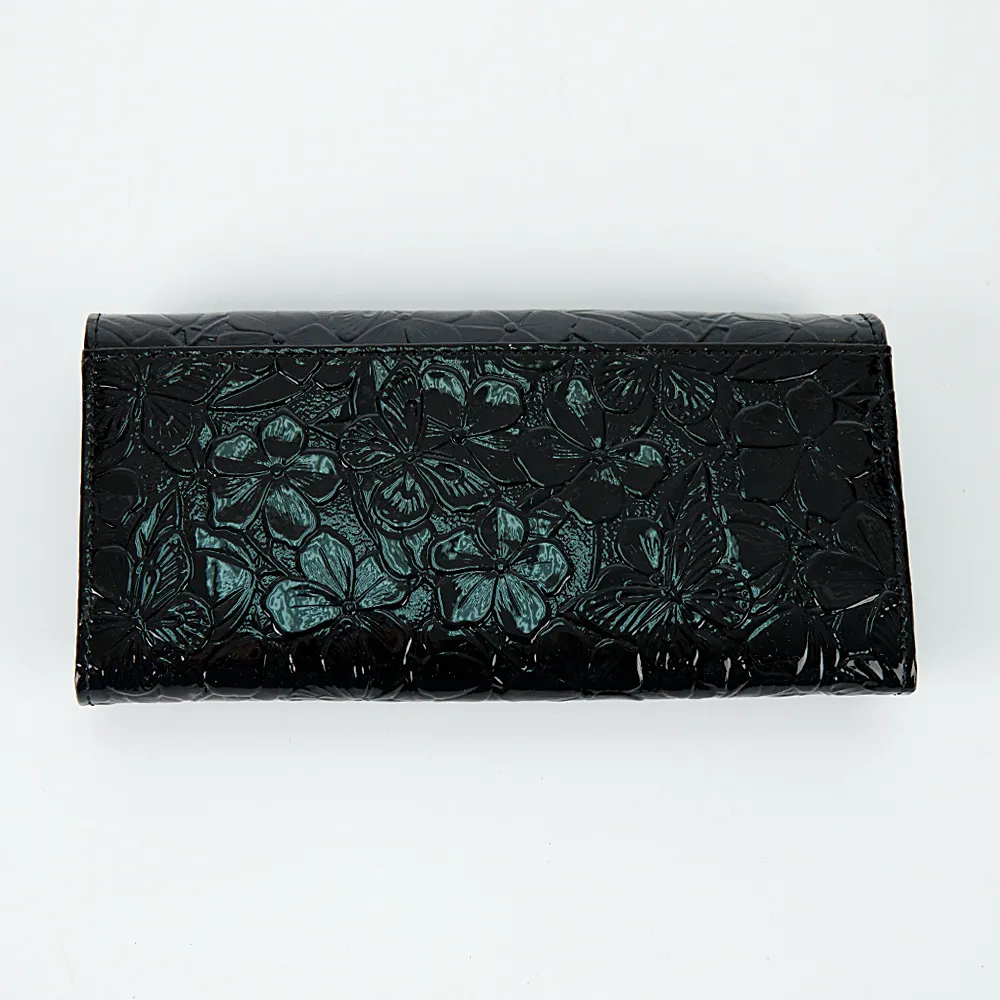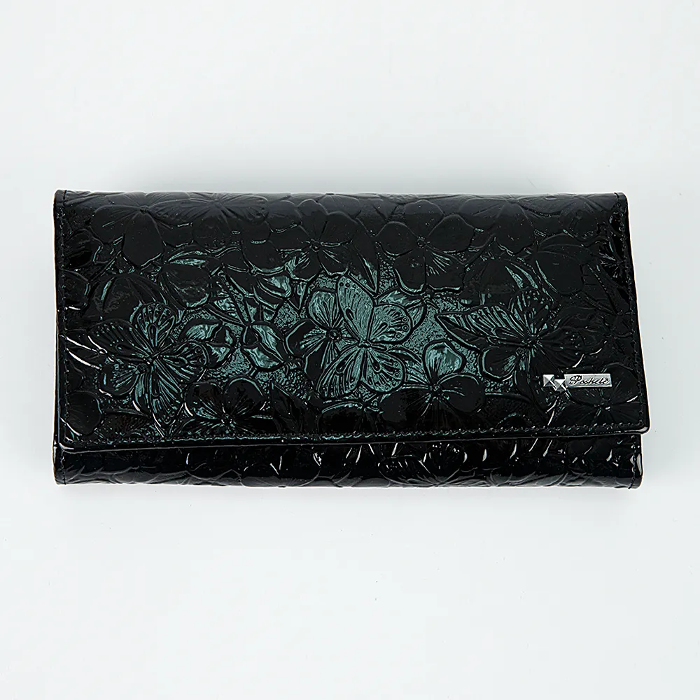 Оригинальный полноразмерный кошелек от бренда Poshete выполнен из натуральной кожи черного цвета. Рельефная текстура с цветами и бабочками придает аксессуару особый шарм. Модель закрывается на кнопку. Внутри: три отделения для купюр, карманы для карт, карман-окошко, карман на молнии. Имеется монетница на рамочном замке «поцелуйчике».