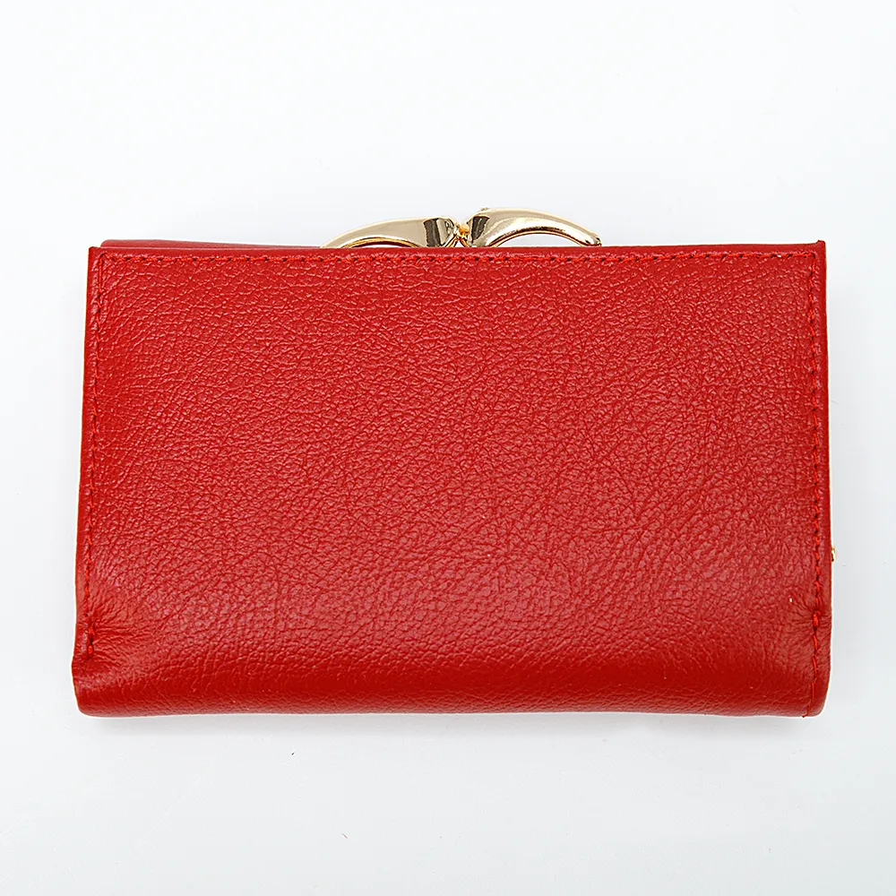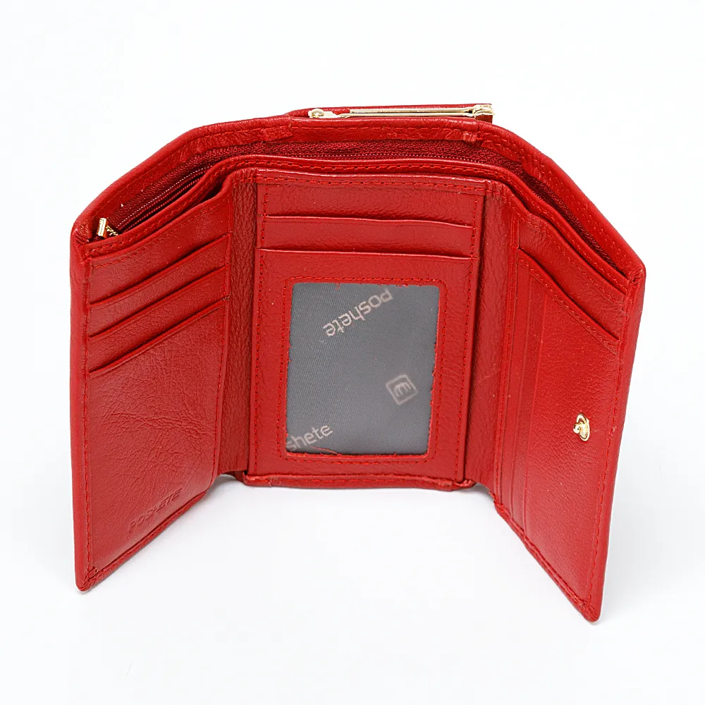 Компактный кошелёк от бренда Poshete выполнен из натуральной кожи и несомненно украсит вашу сумочку. Модель красного цвета с золотистой фурнитурой. Раскрывается книжкой, фиксируется кнопкой, внутри два отделения для купюр, карман на молнии и кармашки для карточек. Снаружи отделение на замке поцелуйчике для монет.