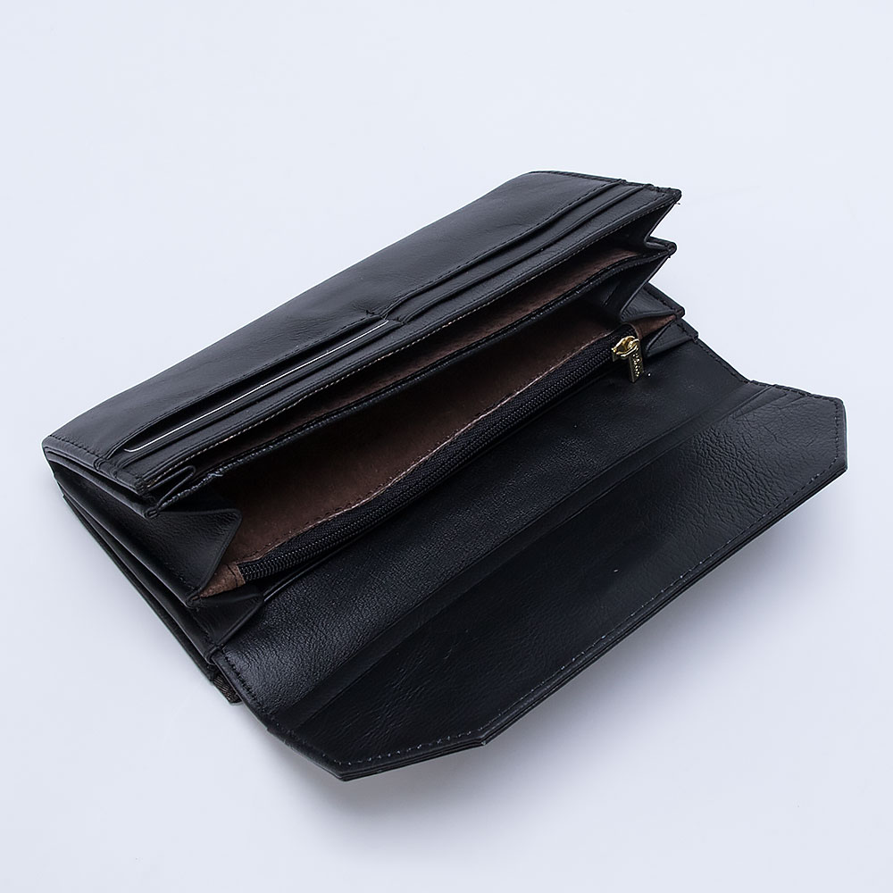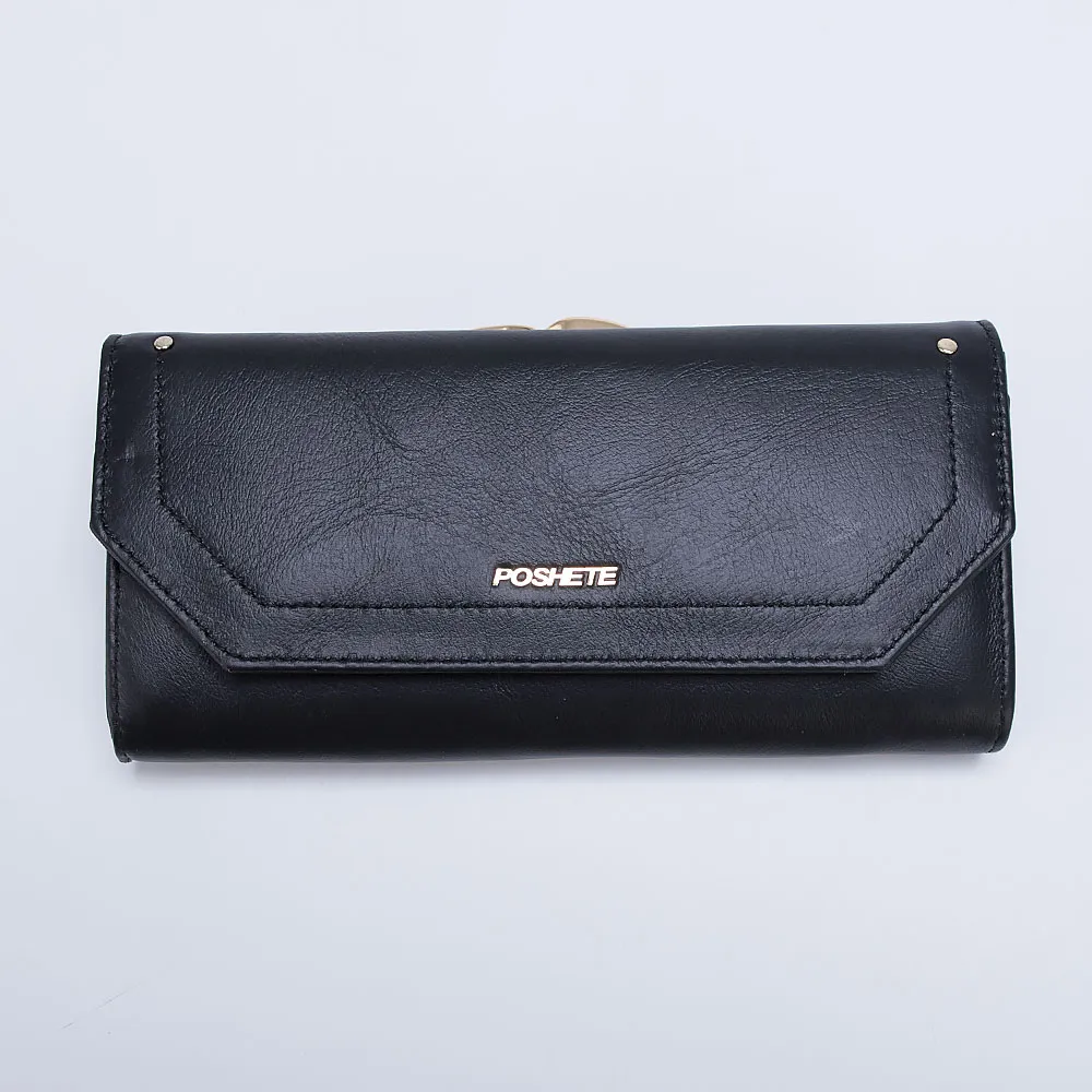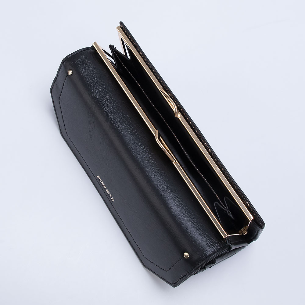 Полноразмерный кошелек от торговой марки Poshete выполнен из натуральной кожи черного цвета с золотистой фурнитурой. Закрывается фигурным клапаном на скрытый магнит. Внутри: фирменная подкладка, отделения для купюр, карманы для карт, карман на молнии. Снаружи: отделение на замке «поцелуйчике» для монет.