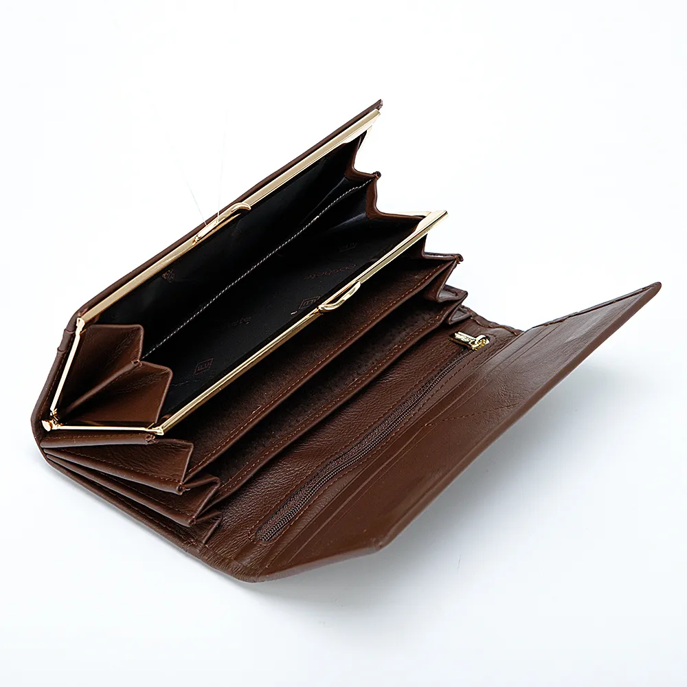 Классический большой кошелёк от бренда Poshete выполнен из натуральной кожи. Модель тёмно-коричневого цвета с золотистой фурнитурой. Фиксируется клапаном на магниты, внутри три отделения для купюр, карман на молнии, четыре кармашка для карточек и отделение на замке поцелуйчике для монет.