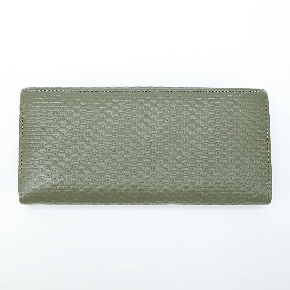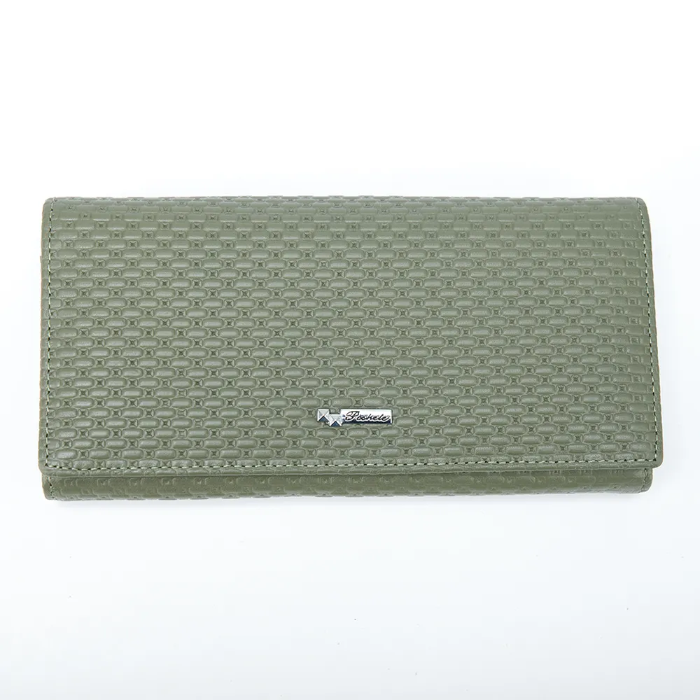Большой женский кошелёк Poshete пастельного зелёного цвета, выполнен из натуральной матовой кожи с фактурным тиснением. Внутри три отделения для купюр, кармашек на молнии, отделение для монет на металлической застёжке и девять кармашков для карточек. Удобный в использовании, закрывается на кнопку.