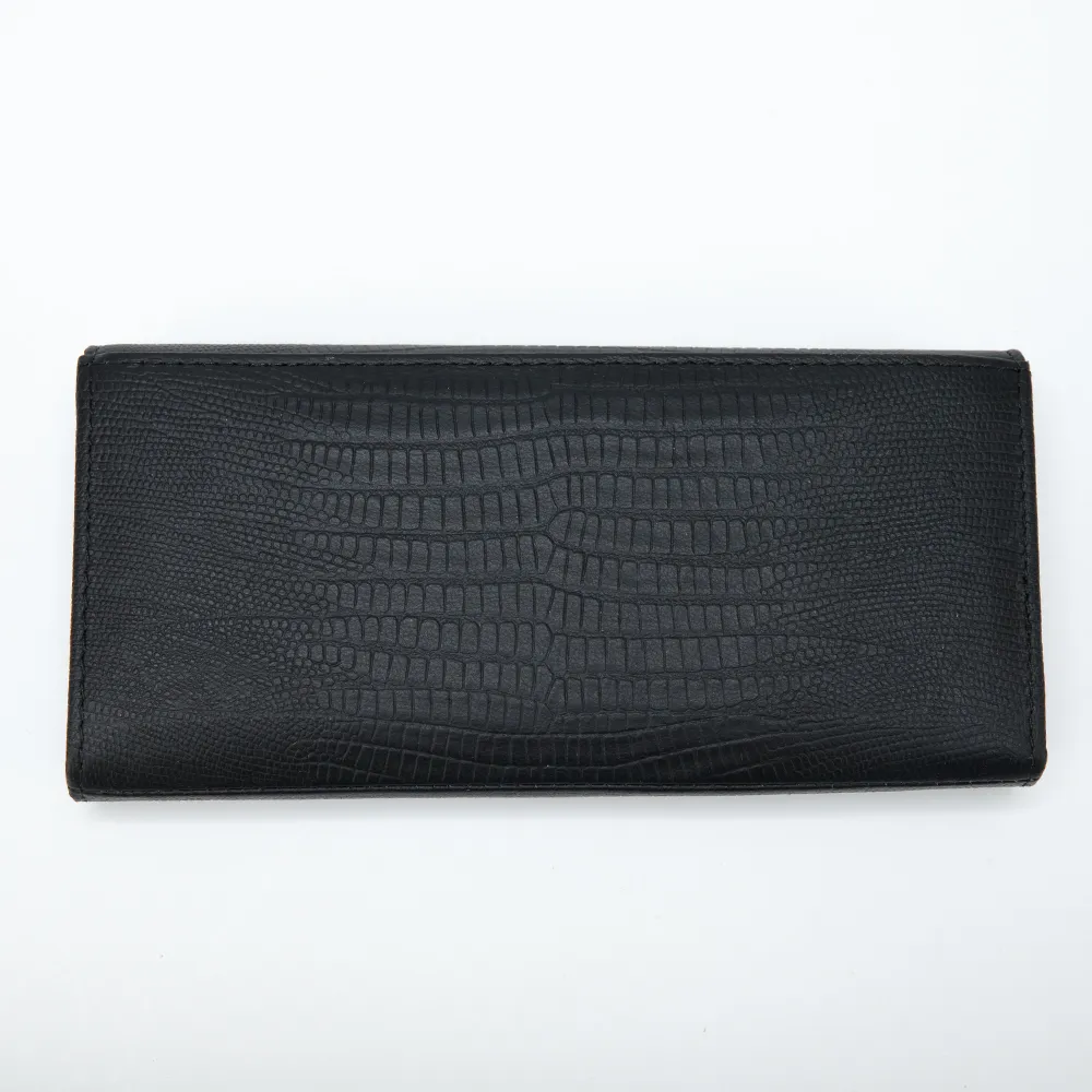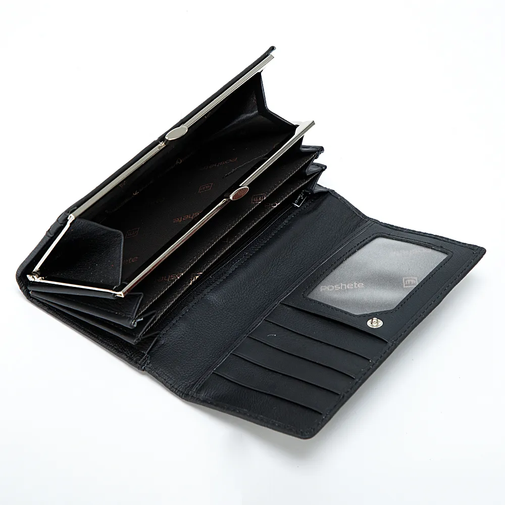 Кошелёк Poshete о котором мечтает ваша сумочка выполнен из натуральной кожи и украшен элегантным тиснением под рептилию. Модель чёрного цвета, классической формы и размера. Снаружи накладной карман без застёжки. Основная часть фиксируется кнопкой. Внутри три отделения для купюр, девять кармашков для карт, одно из которых с окошком, два дополнительных кармана и отделение на замке-поцелуйчике для монет.
