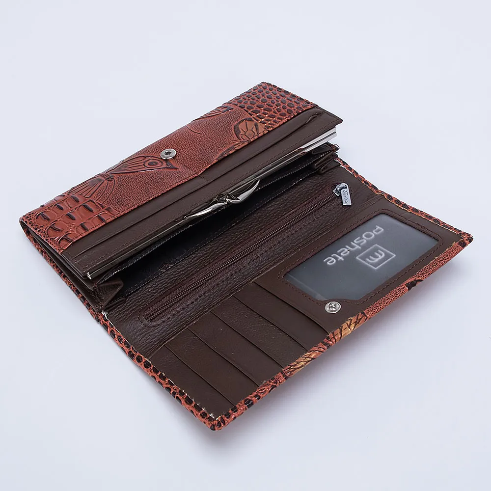 Кошелёк Poshete о котором мечтает ваша сумочка выполнен из натуральной кожи и украшен фактурным тиснением в виде бабочек. Модель коричневого цвета, классической формы и размера. Снаружи накладной карман без застёжки. Основная часть фиксируется кнопкой. Внутри три отделения для купюр, девять кармашков для карт, одно из которых с окошком, два дополнительных кармана и отделение на замке-поцелуйчике для монет.