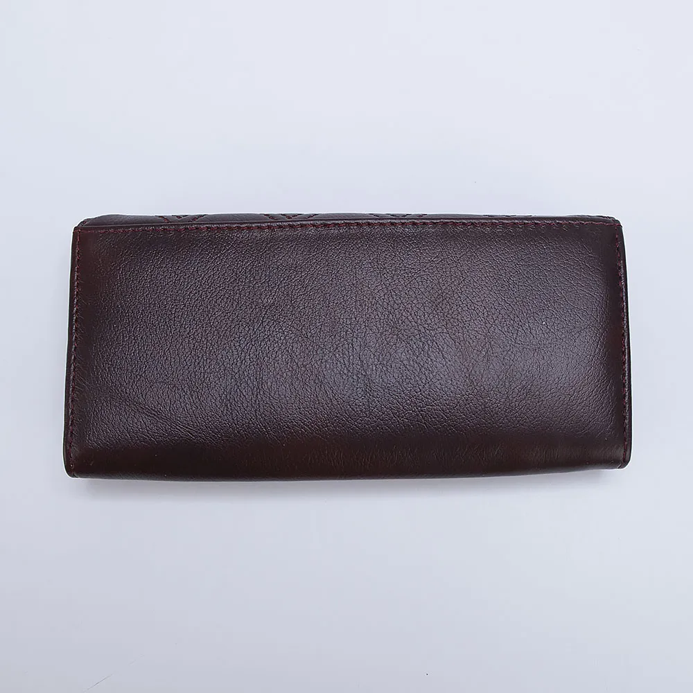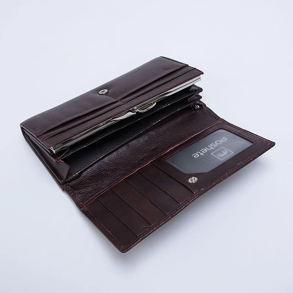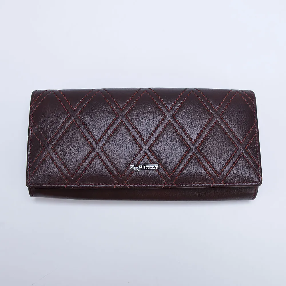 Полноразмерный кошелек от торговой марки Poshete изготовлен из натуральной кожи с ромбовидным блинтовым тиснением в бордовом цвете. Закрывается клапаном на кнопке. Внутри: отделение на рамочном замке фермуар, отделения для купюр, карман на молнии, карманы для пластиковых карт, карман-окошко.