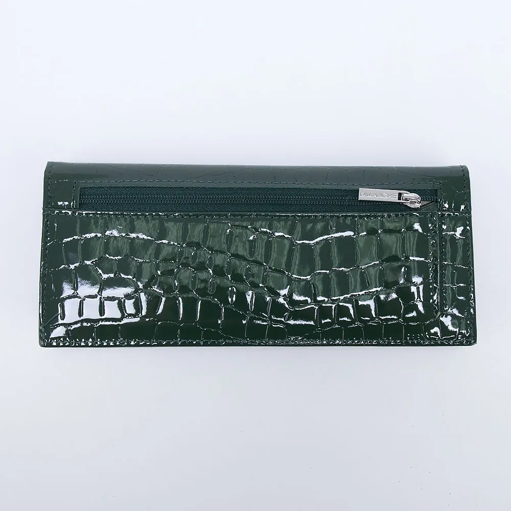 Полноразмерный кошелек от торговой марки Dimanche из натуральной лакированной кожи зеленого цвета с тиснением под крокодиловую кожу. Закрывается клапаном на кнопку. Внутри: отделение для купюр, карманы для карт. На задней стороне - карман для монет на молнии.