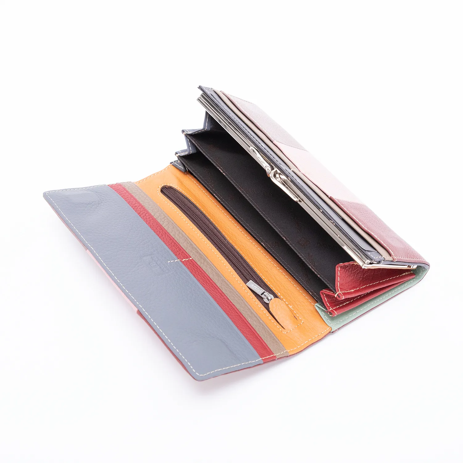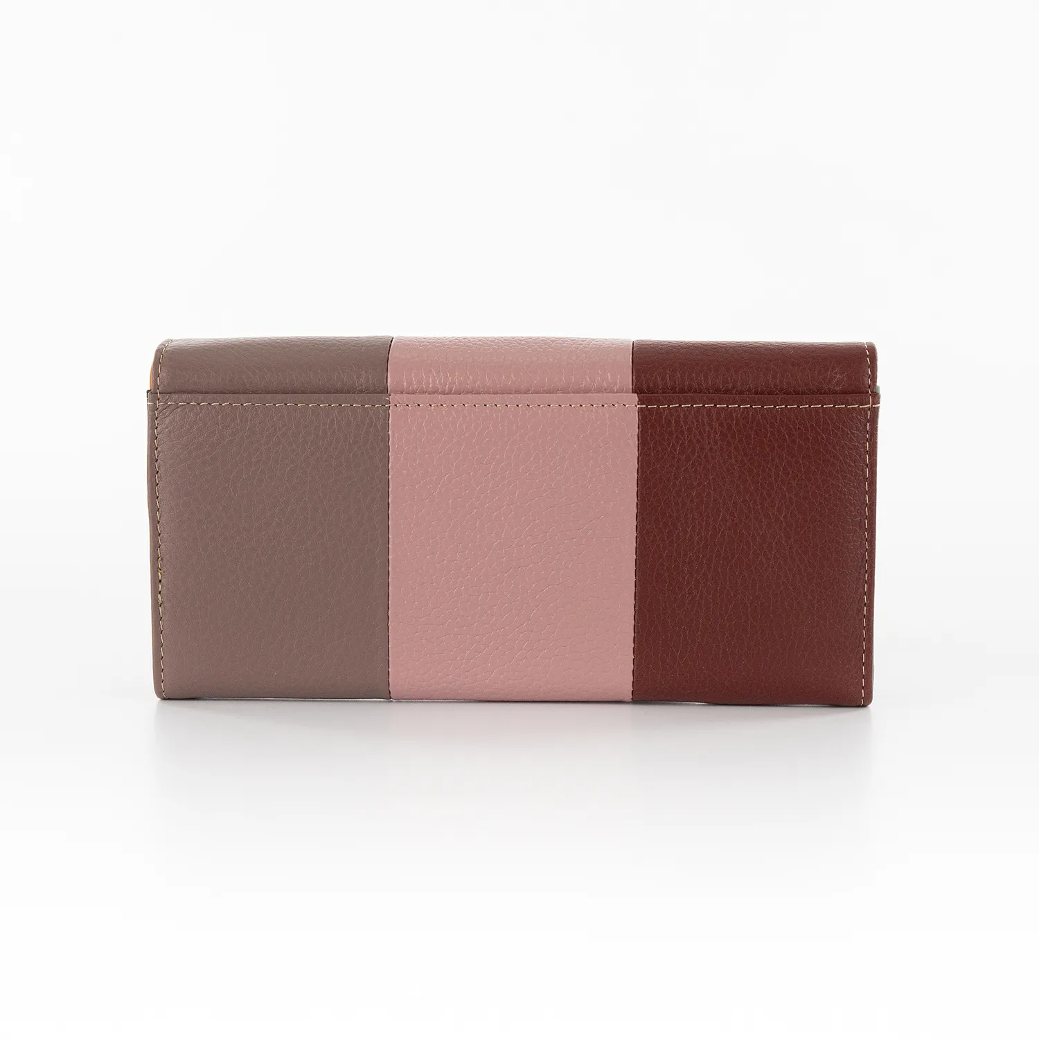Полноразмерный кошелек от торговой марки Poshete изготовлен из натуральной кожи в сочетании бордового, розового и кофейного цвета. Модель закрывается клапаном на скрытых магнитах. Внутренние элементы выполнены в яркой расцветке. Внутри: отделение на рамочном замке фермуар, три отделения для купюр, карман на молнии, карманы для пластиковых карт.