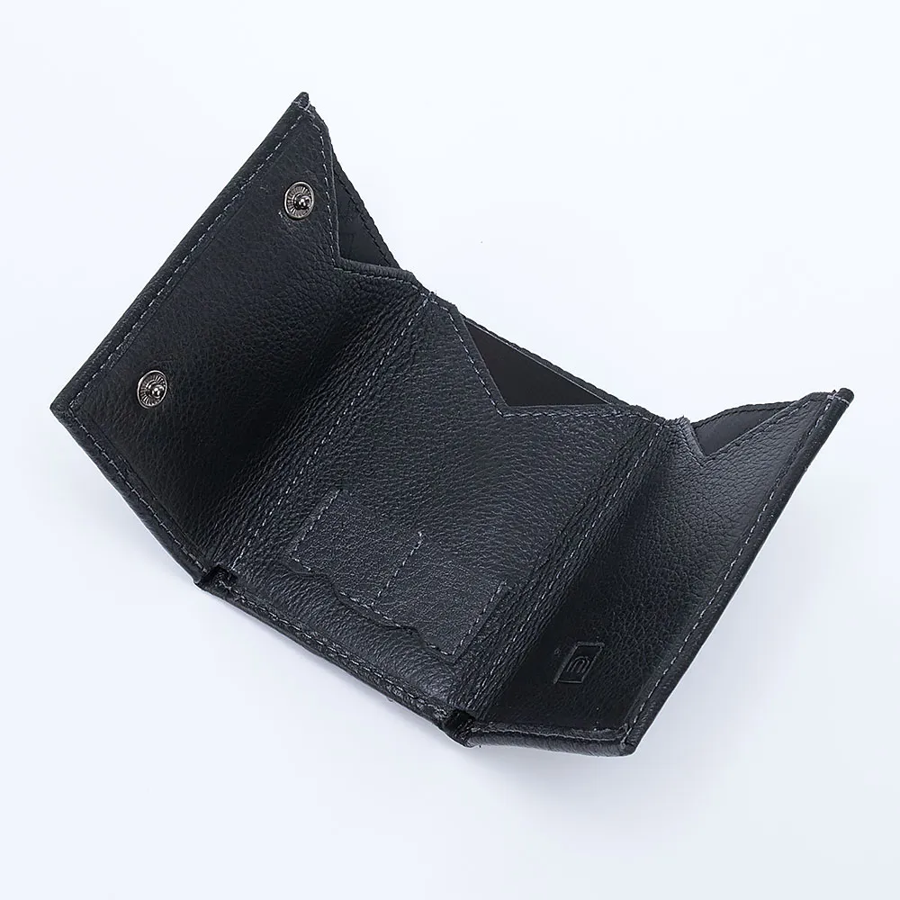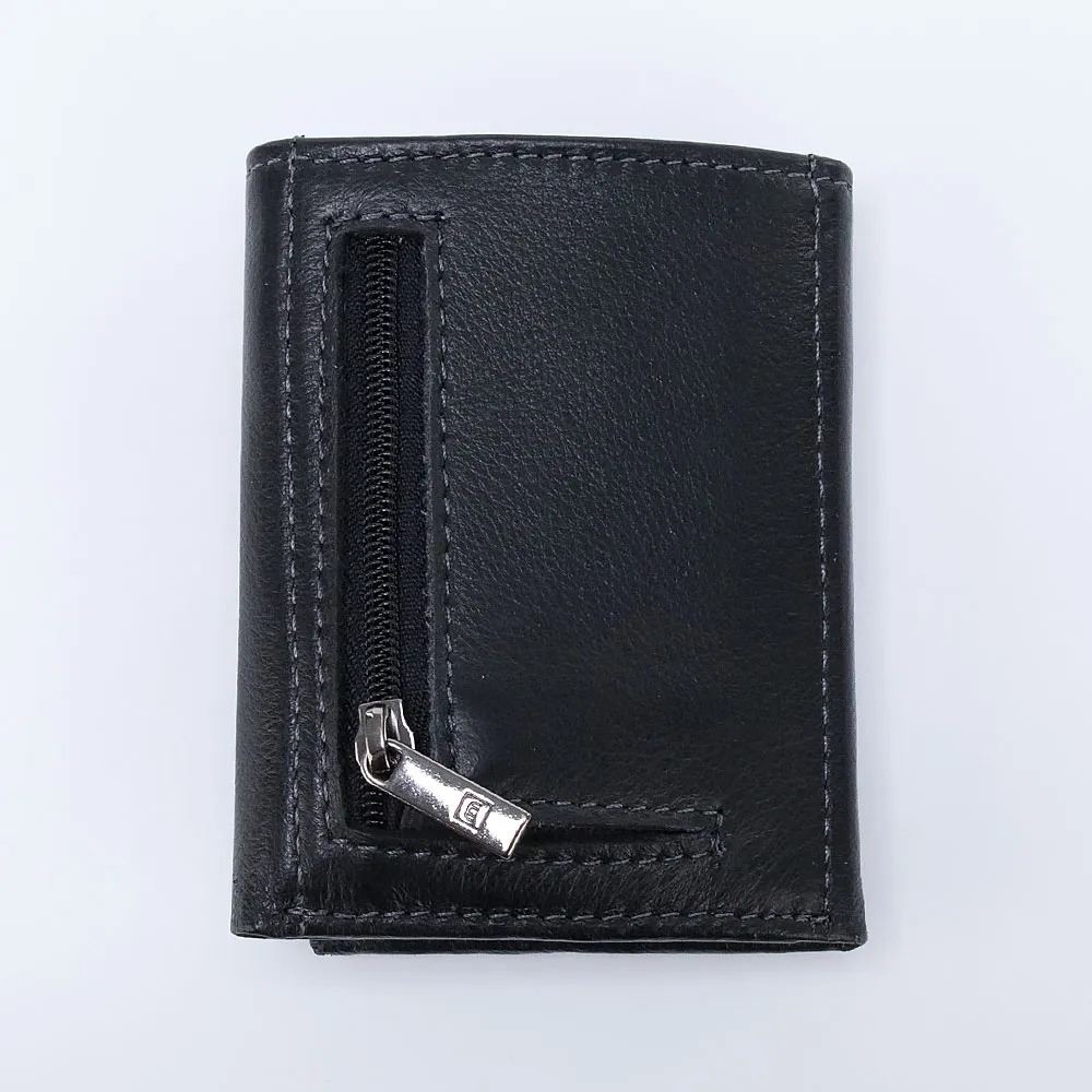 Мужской кошелек от торговой марки Poshete из натуральной кожи черного цвета. Оригинальная компактная модель имеет два сложения, закрывается двумя кнопками. Внутри: карманы для карт и купюр. Снаружи – карман на молнии.