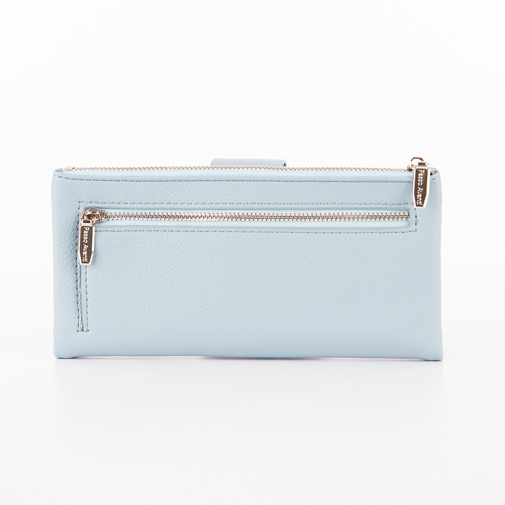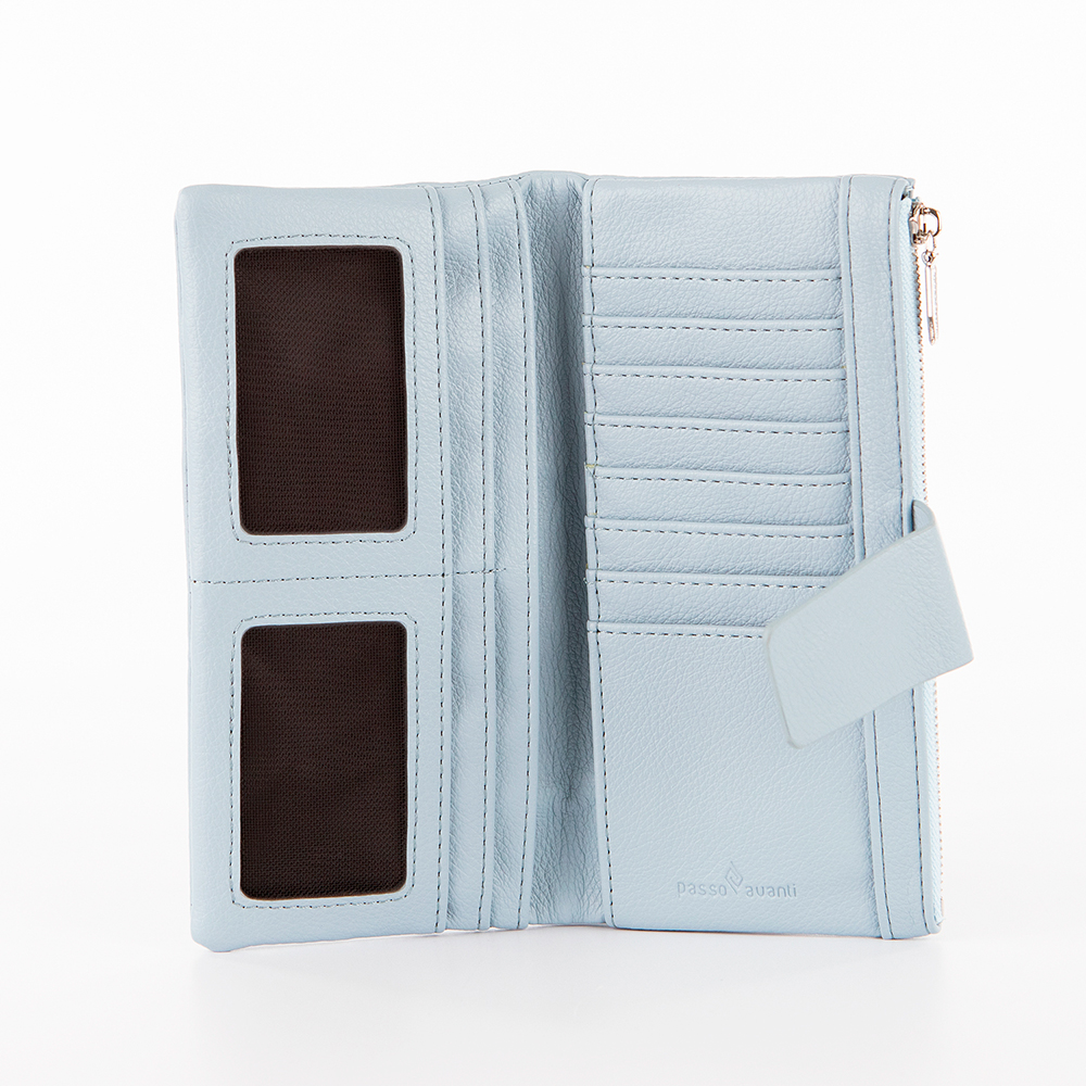 Полноразмерный кошелек от торговой марки Passo Avanti из искусственной кожи голубого цвета. Модель закрывается хлястиком на скрытом магните; раскрывается книжкой. Внутри: карманы для карт, купюр документов, два кармана-окошка. Снаружи – два кармана на молнии.