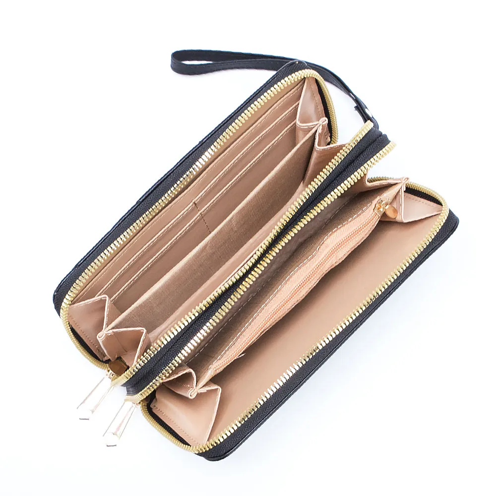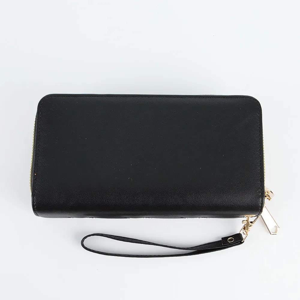Полноразмерный кошелек от торговой марки Passo Avanti из искусственной кожи черного цвета. Модель со съемным ремешком для запястья. Лицевая сторона декорирована оригинальной узорной стежкой. Два отделения на молнии. Внутри: отделения для купюр, карманы для карт, карман на молнии.