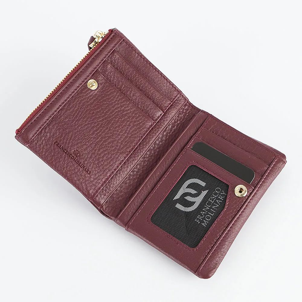 Кошелек от торговой марки Francesco Molinary из натуральной кожи бордового цвета. Модель с одним сложением; раскрывается книжкой, фиксируется кнопкой. Внутри: отделение для купюр, карманы для карт, карман-окошко. Снаружи имеется два кармана на молнии.