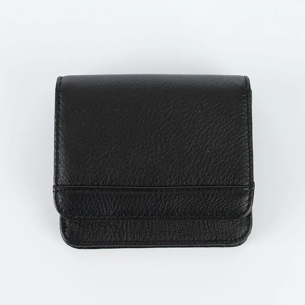 Кошелек от торговой марки Francesco Molinary из натуральной кожи черного цвета. Модель с одним сложением; раскрывается книжкой, фиксируется кнопкой. Внутри: карманы для купюр. На лицевой стороне – отделение с клапаном на кнопке; с карманами для карт внутри.