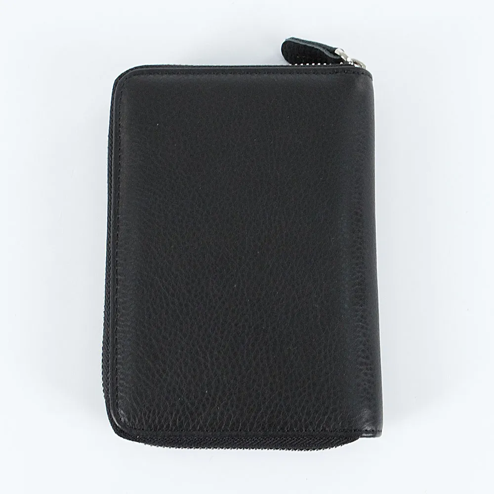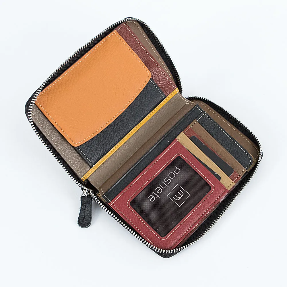 Бумажник от торговой марки Poshete из натуральной кожи черного цвета. Закрывается молнией по трем сторонам, широко раскрывается. Внутри: разноцветные карманы для карт, евромонетница с клапаном на кнопке, перегородка с карманом-окошком, отделением под карты и документы, два отделения для купюр.