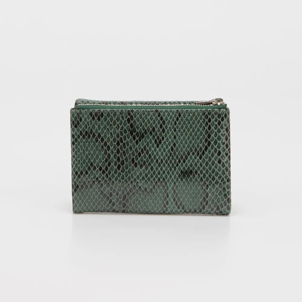 Кошелек от торговой марки Poshete изготовлен из натуральной кожи с тиснением под змеиную кожу. Закрывается закругленным клапаном на скрытых магнитах. Модель с одним сложением. Внутри: отделение для купюр, карманы для карт, сетчатый карман-окошко. Имеется два кармана на молнии, один из которых снаружи.
