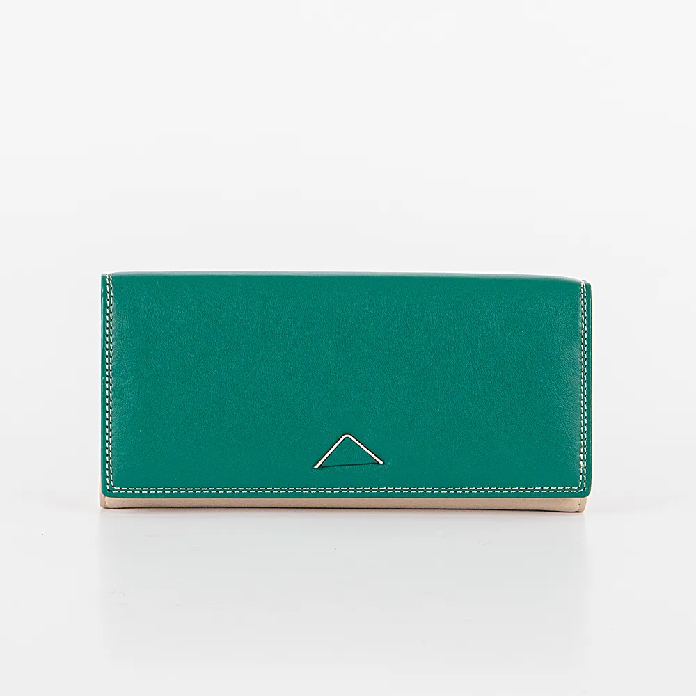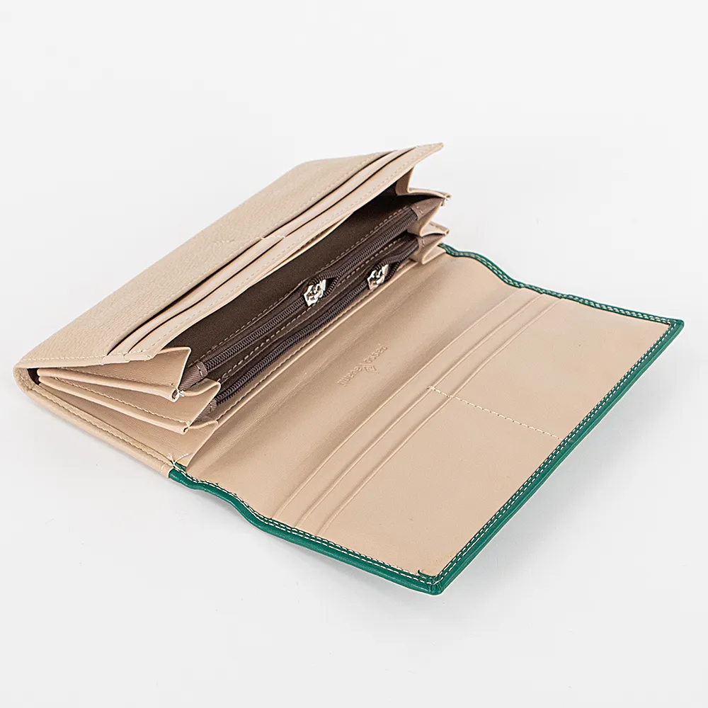 Полноразмерный кошелек от торговой марки Passo Avanti из искусственной кожи в сочетании зеленого и кофейного цвета. Модель закрывается клапаном на скрытых магнитах. Внутри: карманы для купюр, карт, два кармана на молнии.