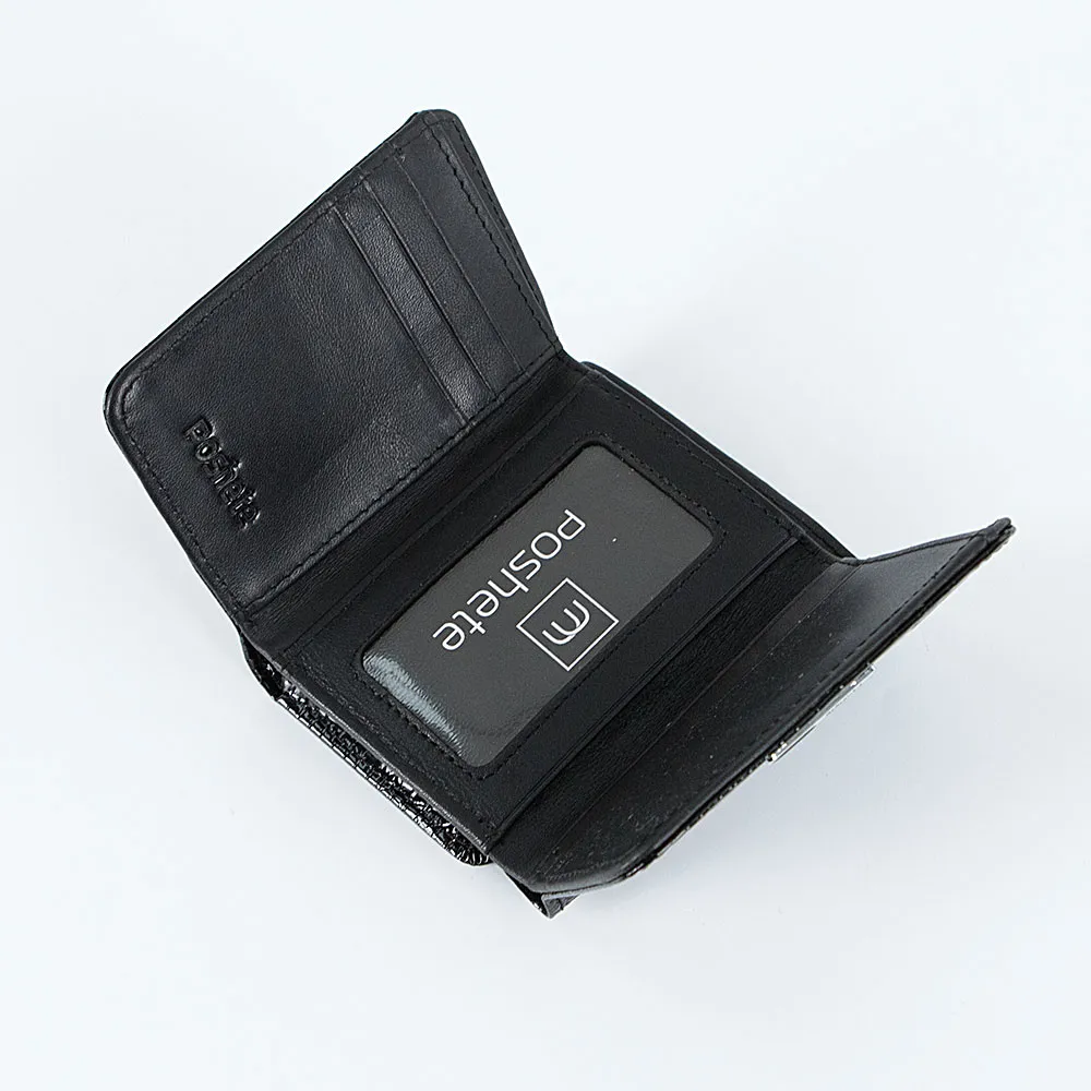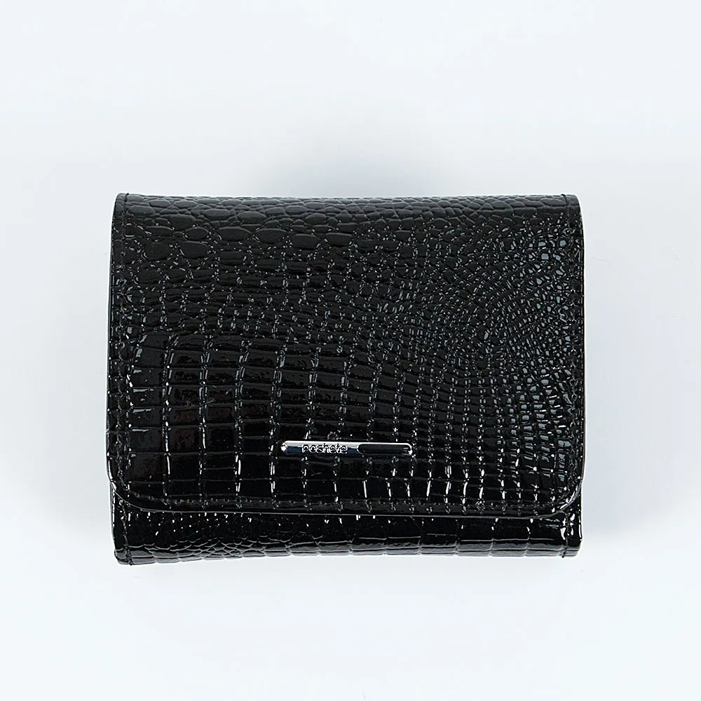 Кошелек от торговой марки Poshete из натуральной лакированной кожи черного цвета с тиснением под рептилию. Модель с двумя сложениями, закрывается клапаном на магните. Внутри: отделение для купюр, карманы для карт, карман-окошко. Снаружи имеется отделение для монет на молнии с перегородкой внутри.