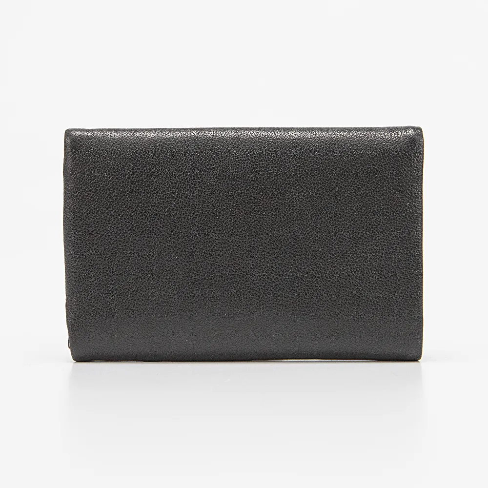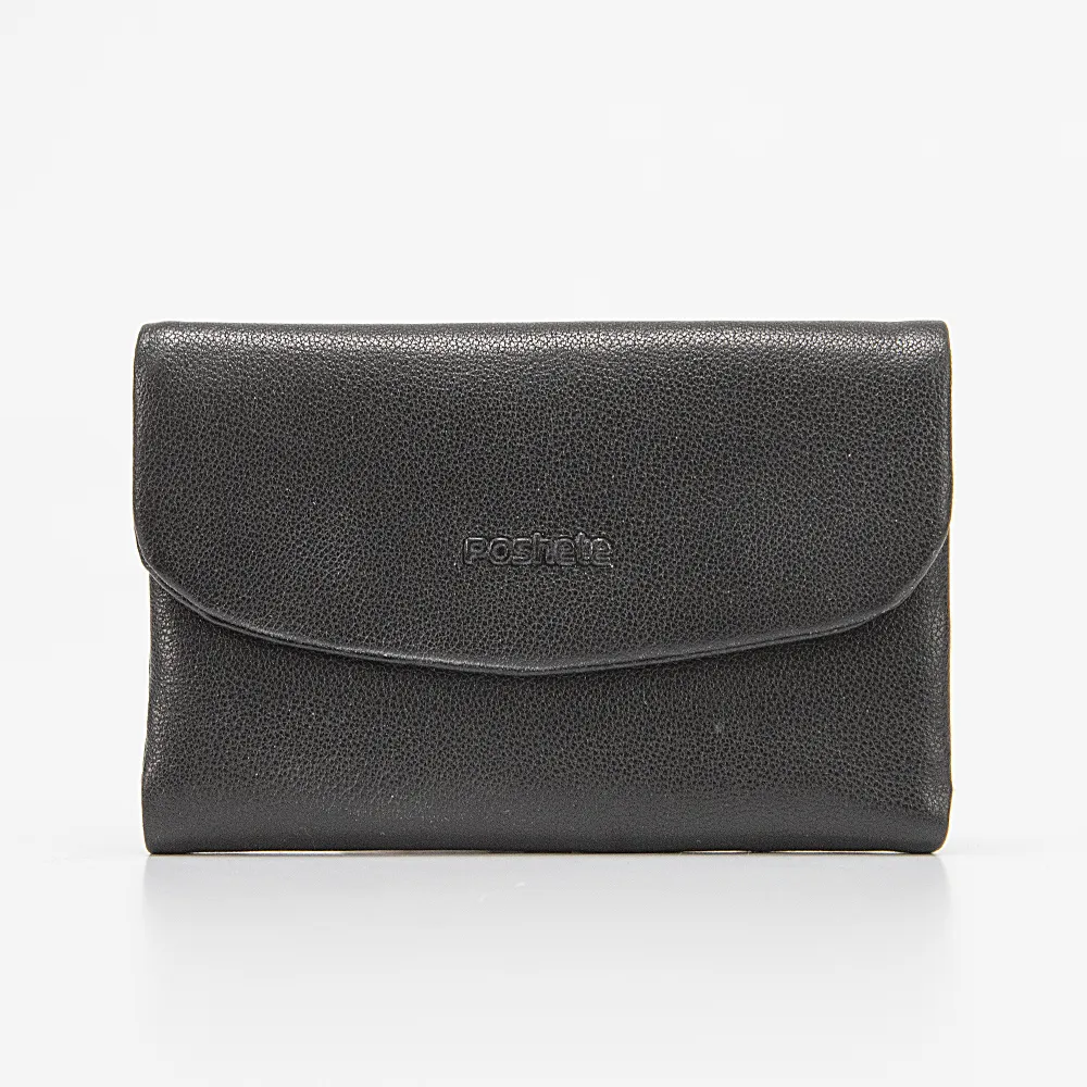 Кошелек от торговой марки Poshete из натуральной кожи черного цвета. Закрывается клапаном на скрытых магнитах. Модель с одним сложением; внутри: карманы для карт, карман-окошко, отделение для купюр, карман на молнии. Снаружи имеется монетница на молнии.