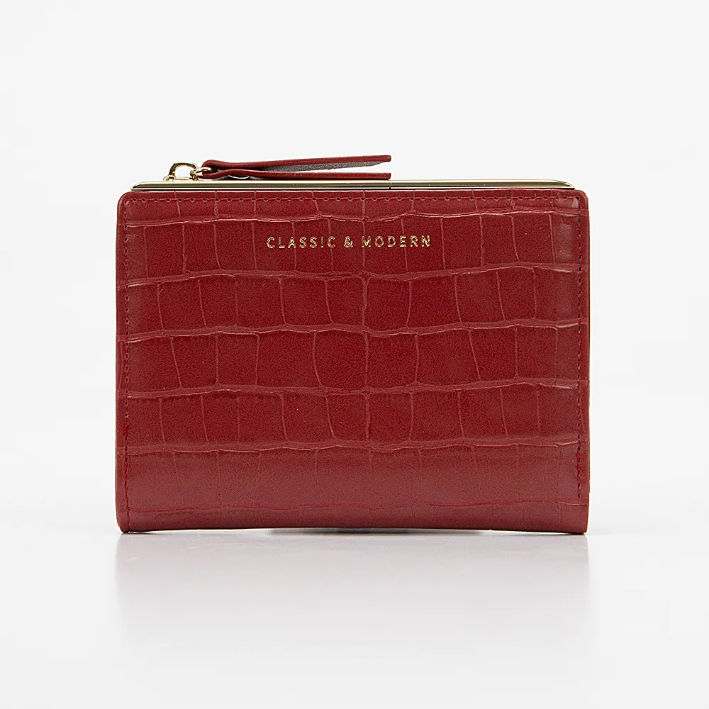 Кошелек от торговой марки Passo Avanti из искусственной кожи красного цвета с тиснением под крокодиловую кожу. Модель раскрывается книжкой, фиксируется кнопкой. Внутри: отделение для купюр, карманы для карт, карман-окошко. Снаружи имеется карман на молнии.