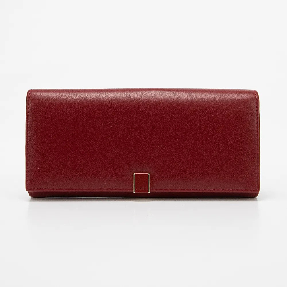 Полноразмерный кошелек от торговой марки Passo Avanti из искусственной кожи бордового цвета. Модель закрывается клапаном на скрытом магните. Внутри: отделения для купюр, отделение для монет с застежкой фермуар, карманы для карт.