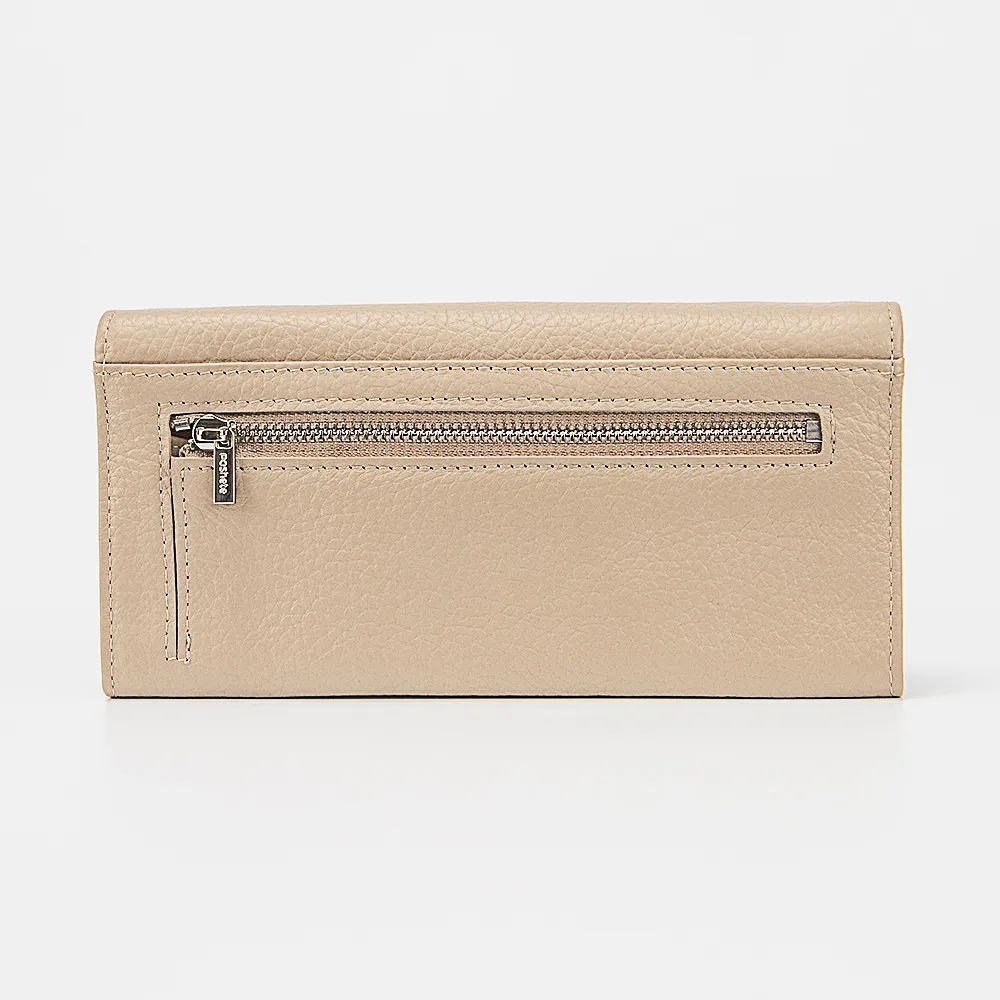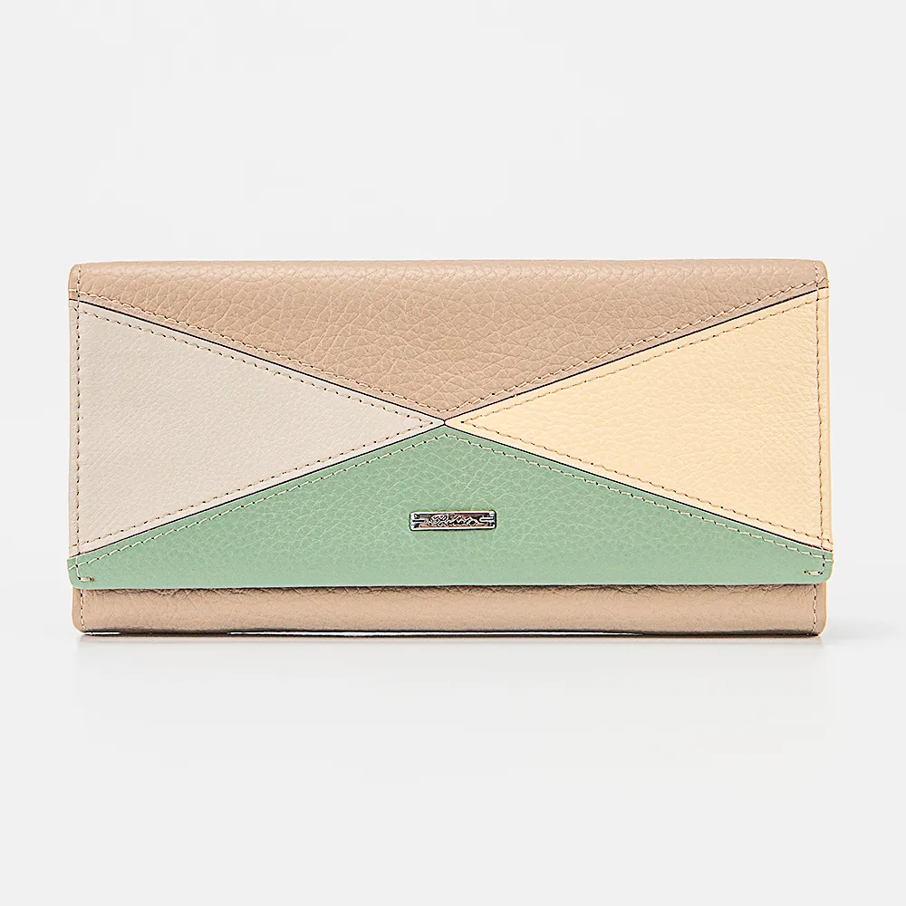 Полноразмерный кошелек от торговой марки Poshete из натуральной кожи. Лицевая сторона декорирована вставками. Закрывается клапаном на скрытых магнитах. Внутри: карманы для карт, карман на молнии, отделение для монет с застежкой фермуар. Снаружи на задней стороне – карман на молнии.