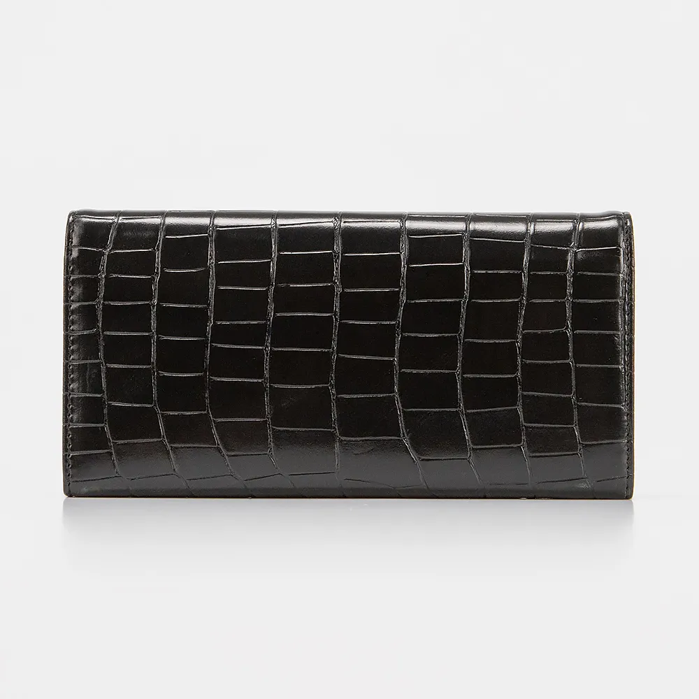 Полноразмерный кошелек от торговой марки Passo Avanti из искусственной кожи с тиснением под рептилию черного цвета. Модель закрывается клапаном на скрытых магнитах. Внутри: карманы для купюр, карт, карман на молнии, отделение для монет с застежкой фермуар.